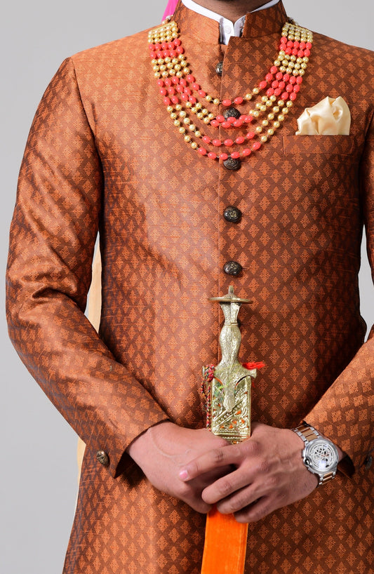 Booti Pattern Brocade Silk Sherwani Achkan Brown Color | Best For Weddings, Grooms, Formal Indian Subcontinent Events Festivals