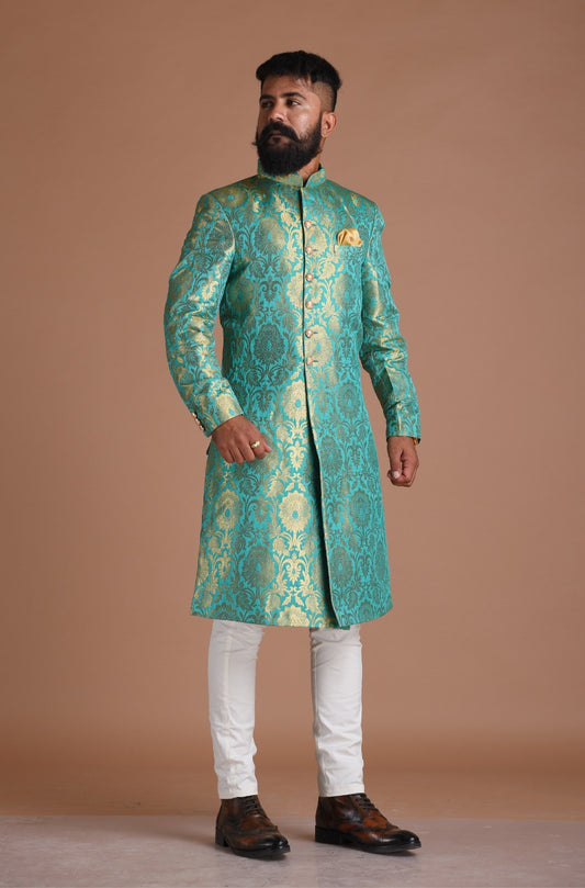 Handmade Vibrant Sea Green Brocade Silk Sherwani
