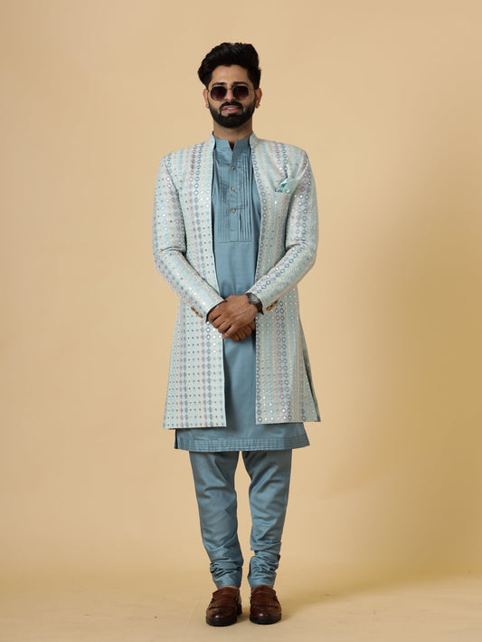 Stunning Mirror Embroidered Sky-Blue Open Sherwani with Turquoise Blue Kurta Pajama for Men | Father Son Combo | Turquoise Blue Color |Sky Blue Sherwani | Perfect for Grooms
