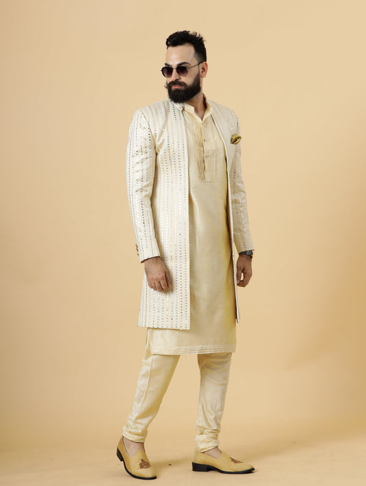 Alluring Mirror Embroidered Cream Open Sherwani with Cream Kurta Pajama for Men | Father Son Combo |Cream Sherwani | Perfect for Grooms