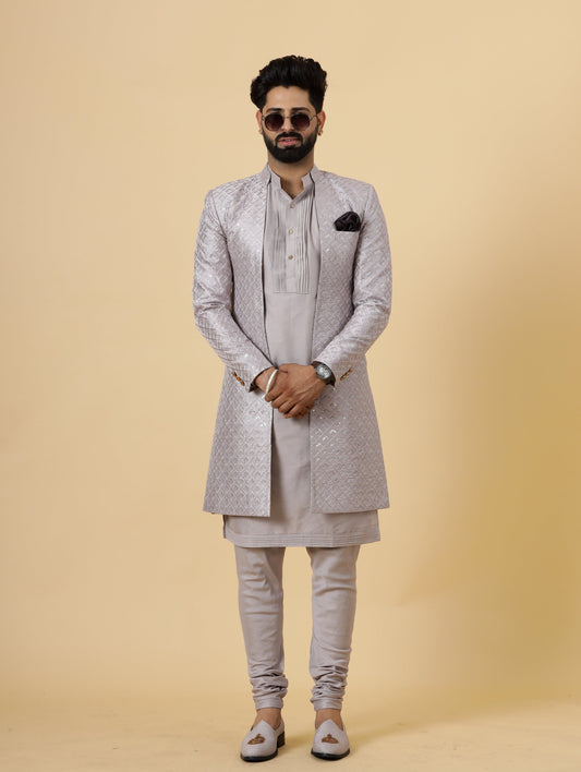Stunning Grey Banarasi Brocade Achkan for Men | Father Son Combo | Pastel Colour Sherwani | Perfect for Grooms