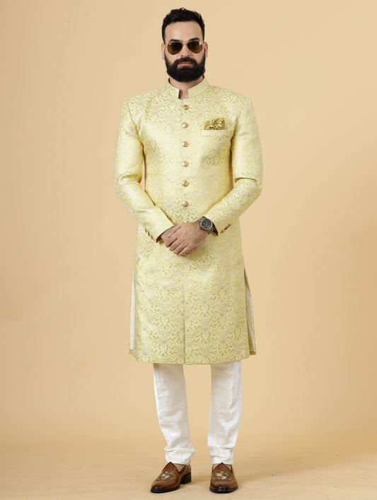 Stunning Light Yellow Banarasi Brocade Achkan for Men | Father Son Combo | Pastel Colour Sherwani | Perfect for Grooms