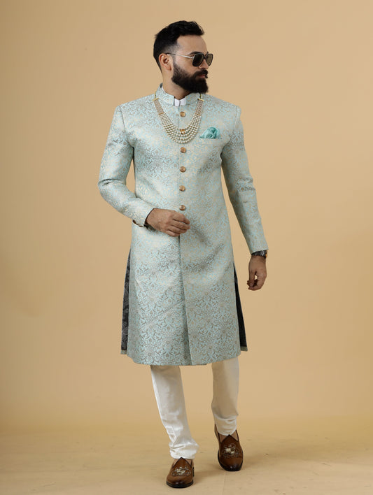 Stunning Sky Blue Banarasi Brocade Achkan for Men | Father Son Combo | Pastel Colour Sherwani | Perfect for Grooms