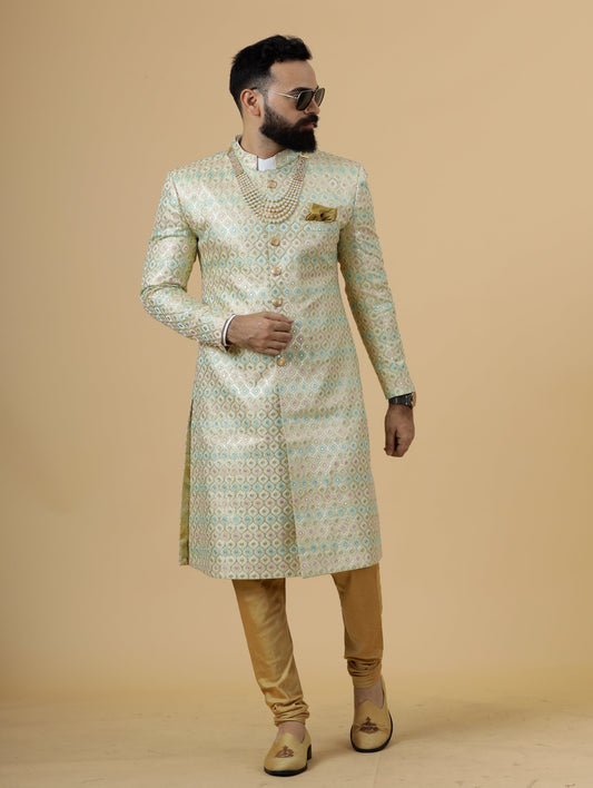 Alluring Mint Green Floral thread embroidered Sherwani for Men | Father Son Combo |Perfect for Grooms