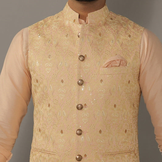 Peach Kurta Pajama Set with Luckhnawi Embroidery Peach Color Nehru Jacket - Handcrafted
