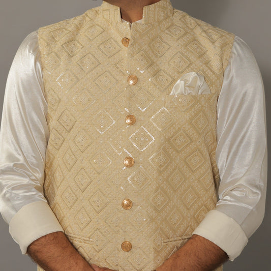 Off-White Kurta Pajama Set with Luckhnawi Embroidery Beige Color Nehru Jacket - Handcrafted