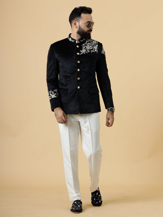 Black Velvet Bandhgala with Hand Floral Threadwork with White Trouser