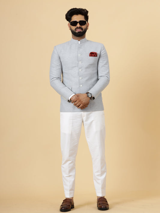 Bespoke Grey Linen Jodhpuri Bandhgala Suit For Men | White Trouser |