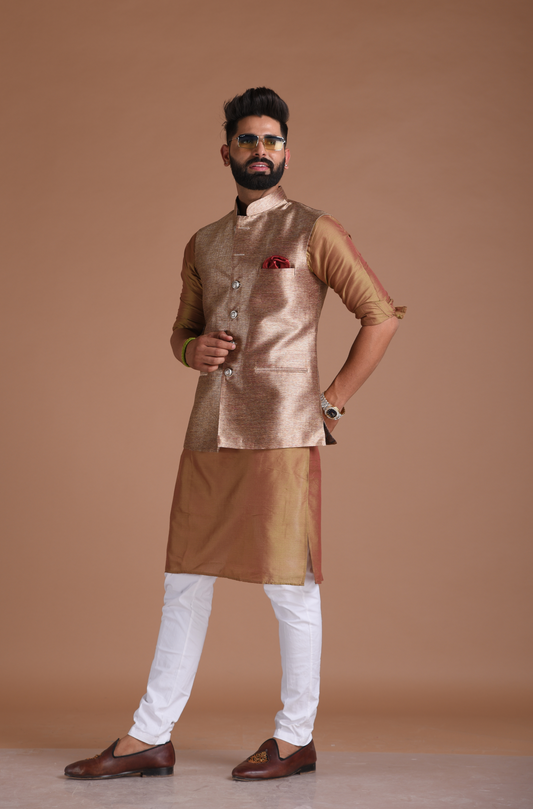 Classic Golden-Grey Brocade Silk Half Jodhpuri Jacket with Slate Grey Kurta-Pajama for Men