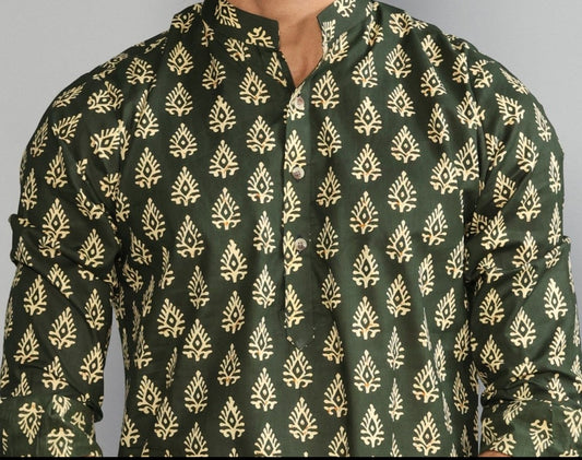 Juniper Green Block Print Sanganeri Kurta With White Pyjama