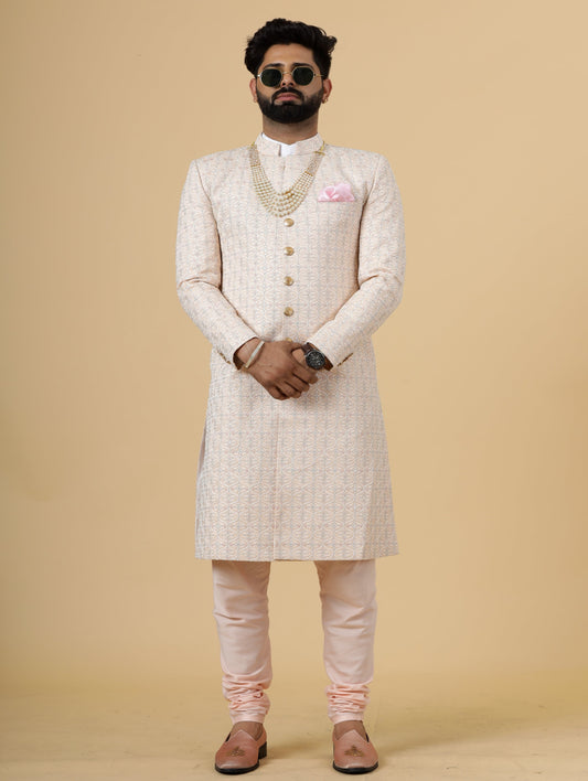 Alluring Peach thread Embroidered Sherwani for Men | Father Son Combo | Perfect Groom Wear