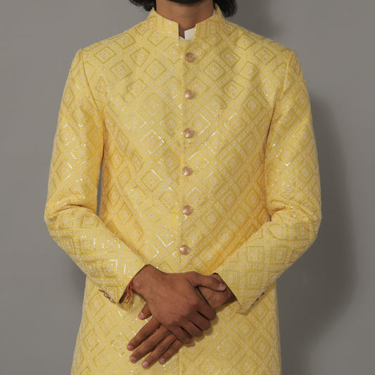 Square Pattern Embroidered Yellow Sherwani With Off White Churidar