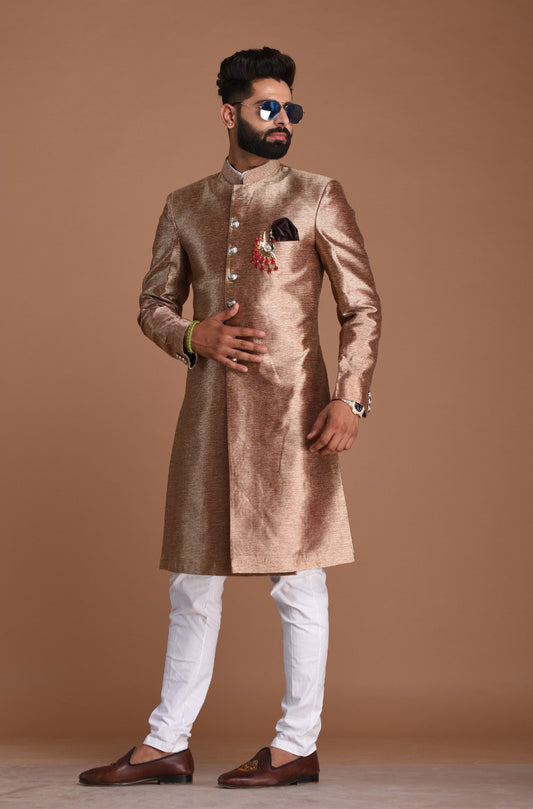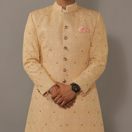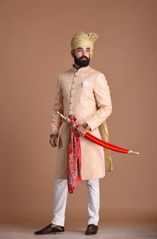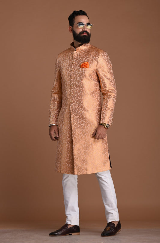 Royal Banarasi Brocade Floral Pattern Melon Color Sherwani