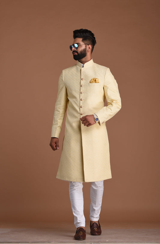 Stunning Yellow Banarasi Brocade Achkan for Men | Father Son Combo | Pastel Colour Sherwani | Perfect for Grooms