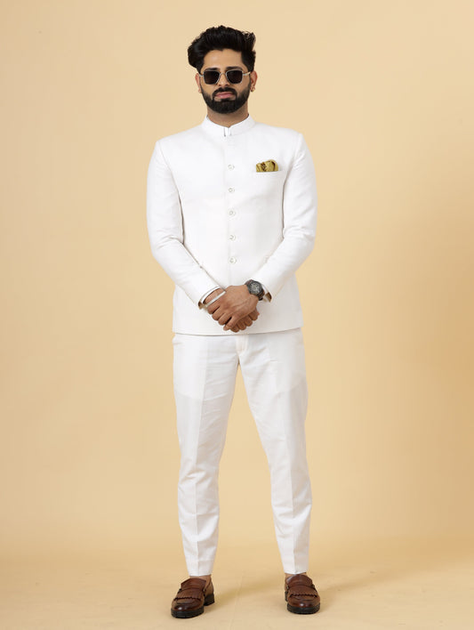 Bespoke White Linen Jodhpuri Bandhgala Suit For Men | White Trouser |