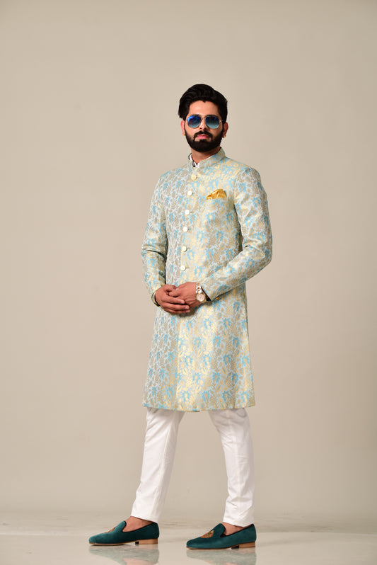 Handmade Sky Blue Gold Maharaja Style Brocade Silk Sherwani