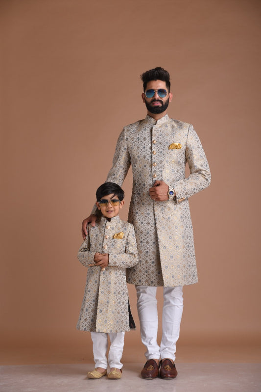 Golden Grey Royal Floral Pattern Banarasi Kim-Khab Sherwani