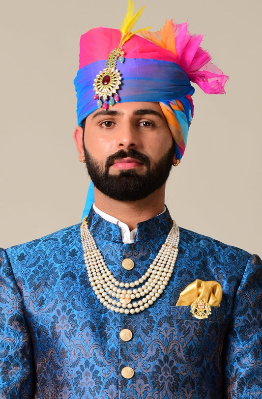 Handmade Royal Blue Leaf Pattern Brocade Silk Sherwani