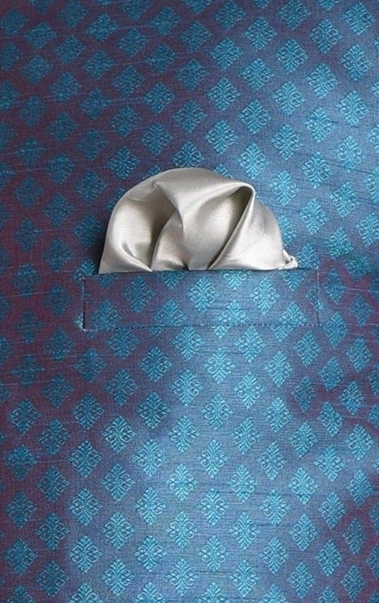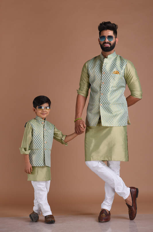 Brocade Silk Kurta Pajama Nehru Jacket Set in Sea Green