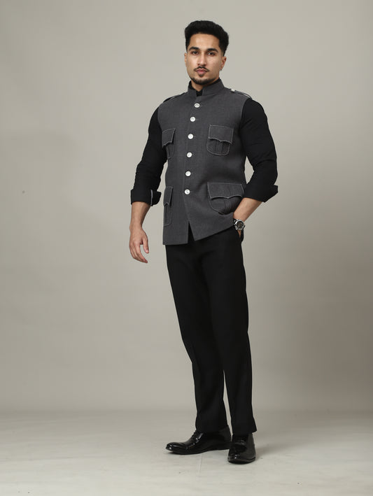 Black Tweed Semi-Hunting Waistcoat with Contrast Stitching
