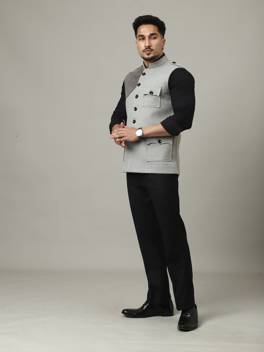 Ash Grey Striped Semi-Hunting Jacket with Suede Patch