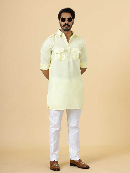 Light Yellow Cotton Hunting Style Kurta-Pajama Set