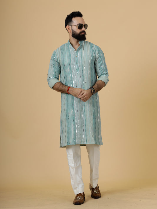 Alluring Turquoise Dual Color Mirror Embroidered Kurta-Pajama for Men
