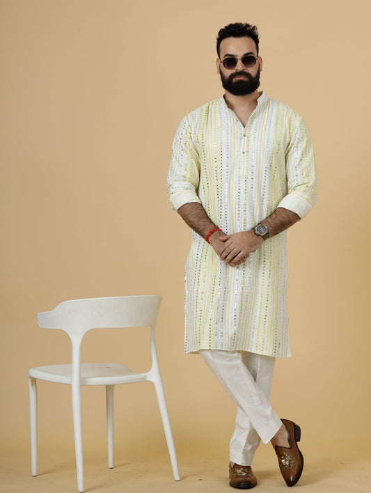 Alluring Yellow Dual Color Mirror Embroidered Kurta-Pajama for Men