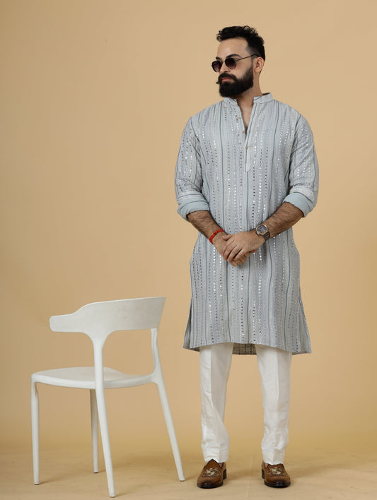 Alluring Grey Dual Color Mirror Embroidered Kurta-Pajama for Men