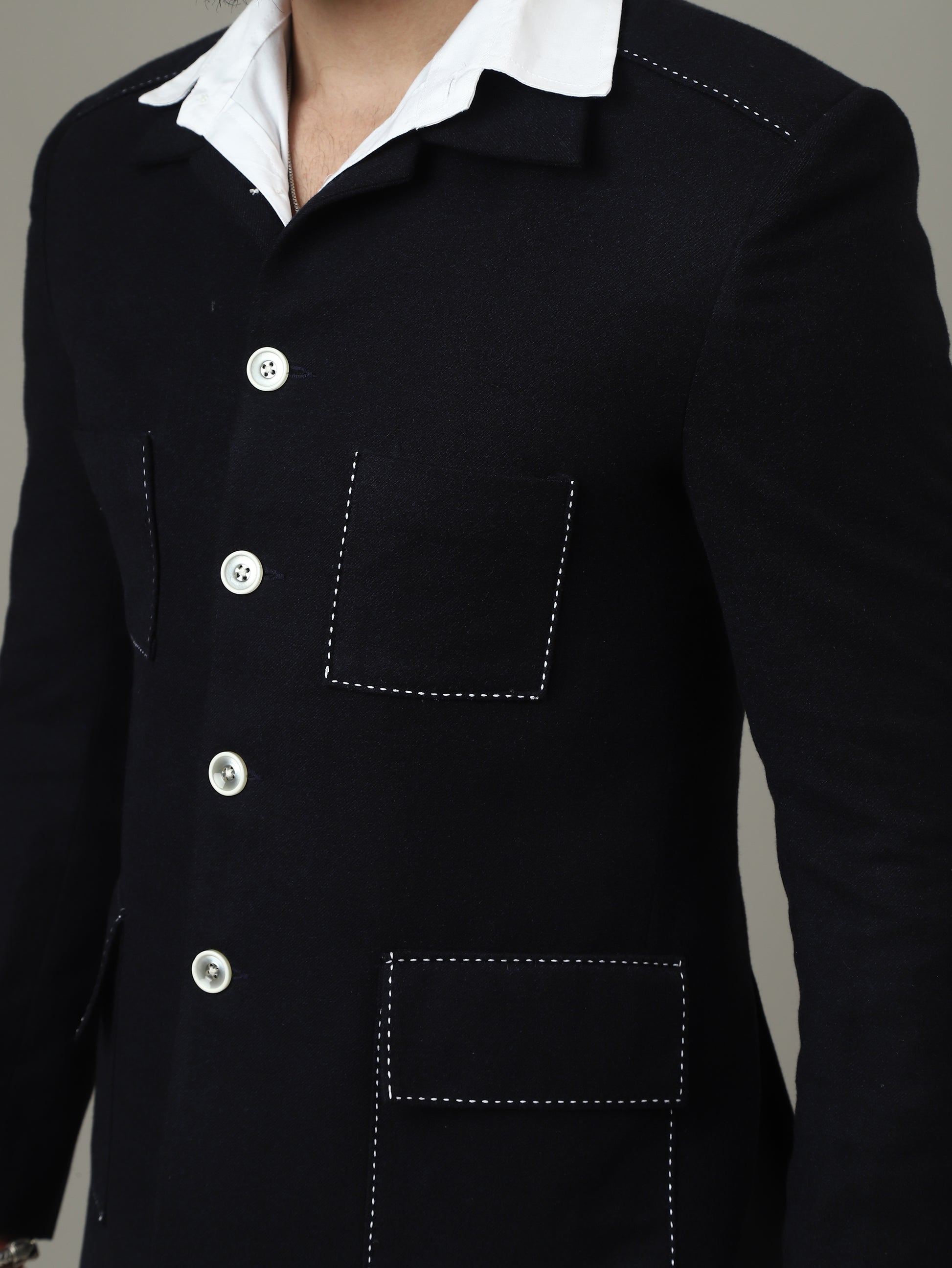 The deep navy tone paired with the signature curved pockets and contrast stitching creates a distinguished look — subtle, sharp, and effortlessly stylish. Designed for men who prefer elegance with structure, the bushcoat offers a confident presence whether paired with trousers, chinos, or festive kurta sets.
