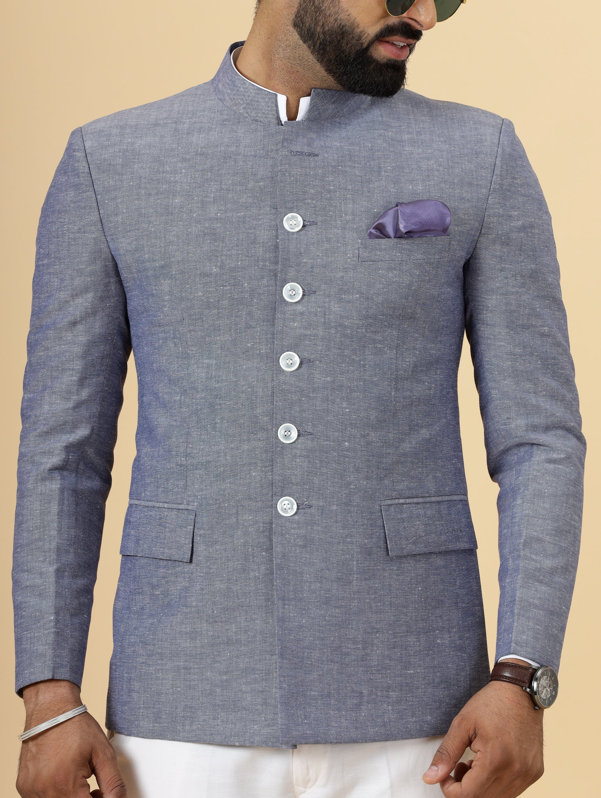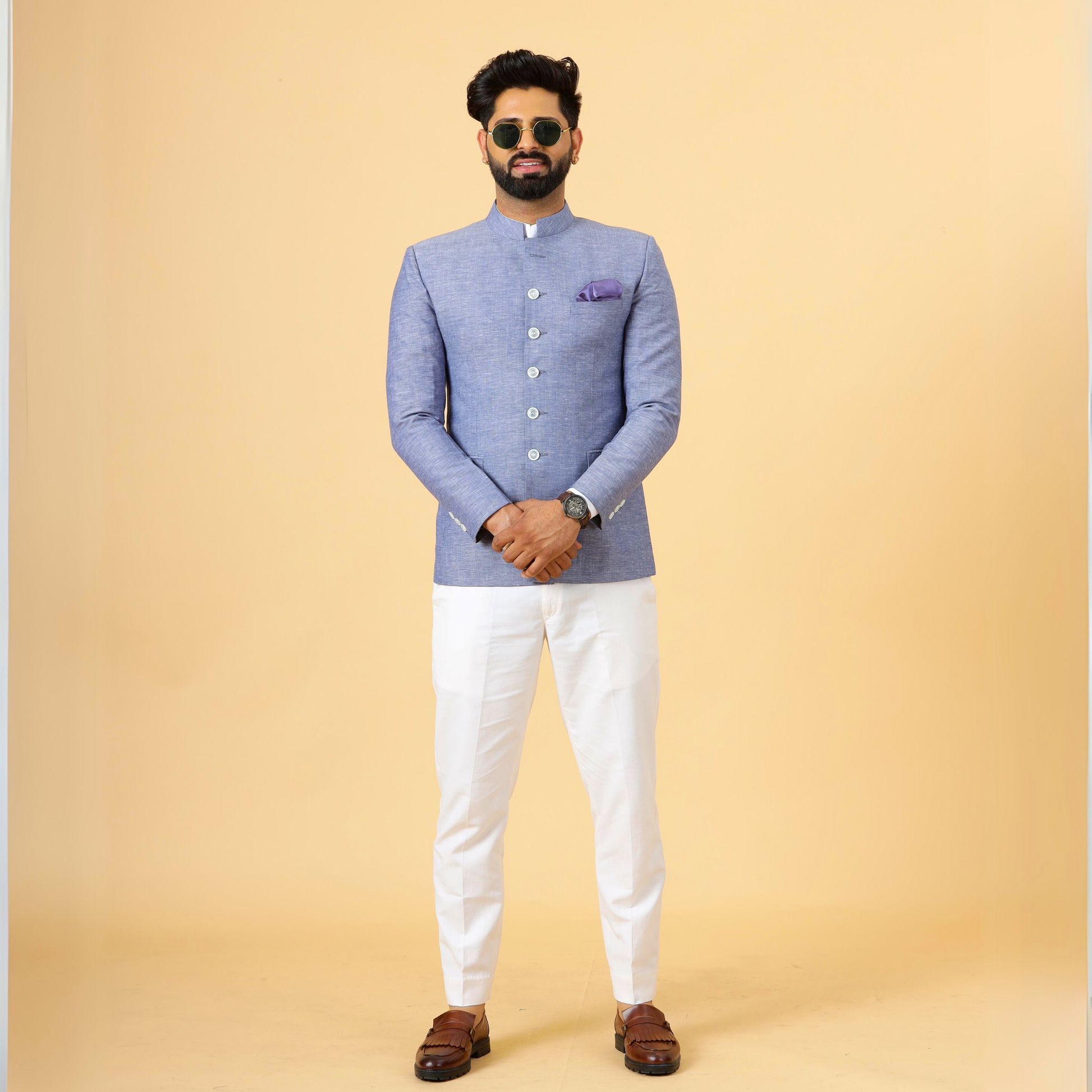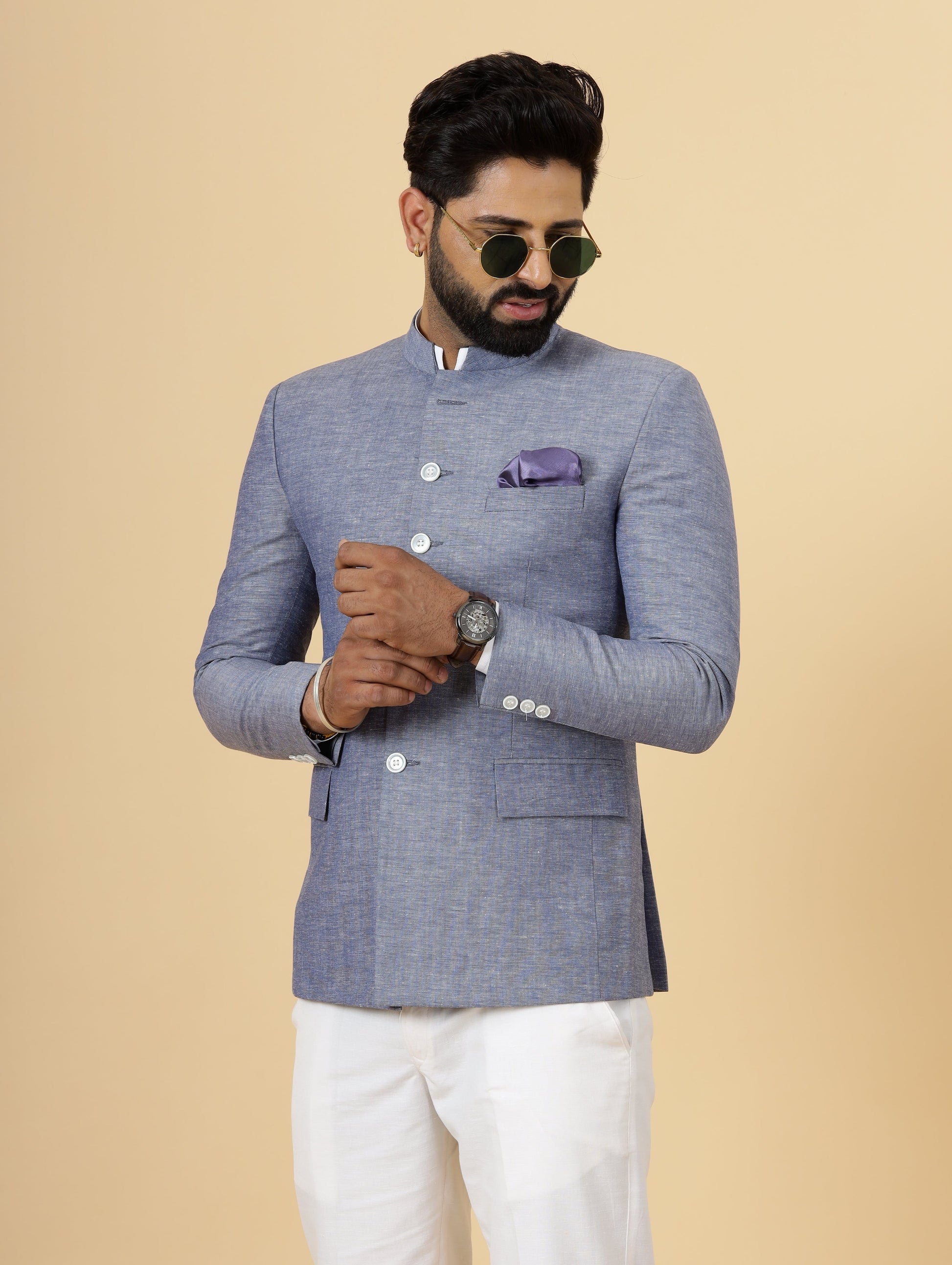 Bespoke Midnight Blue Linen Jodhpuri Bandhgala Suit For Men | White Trouser |