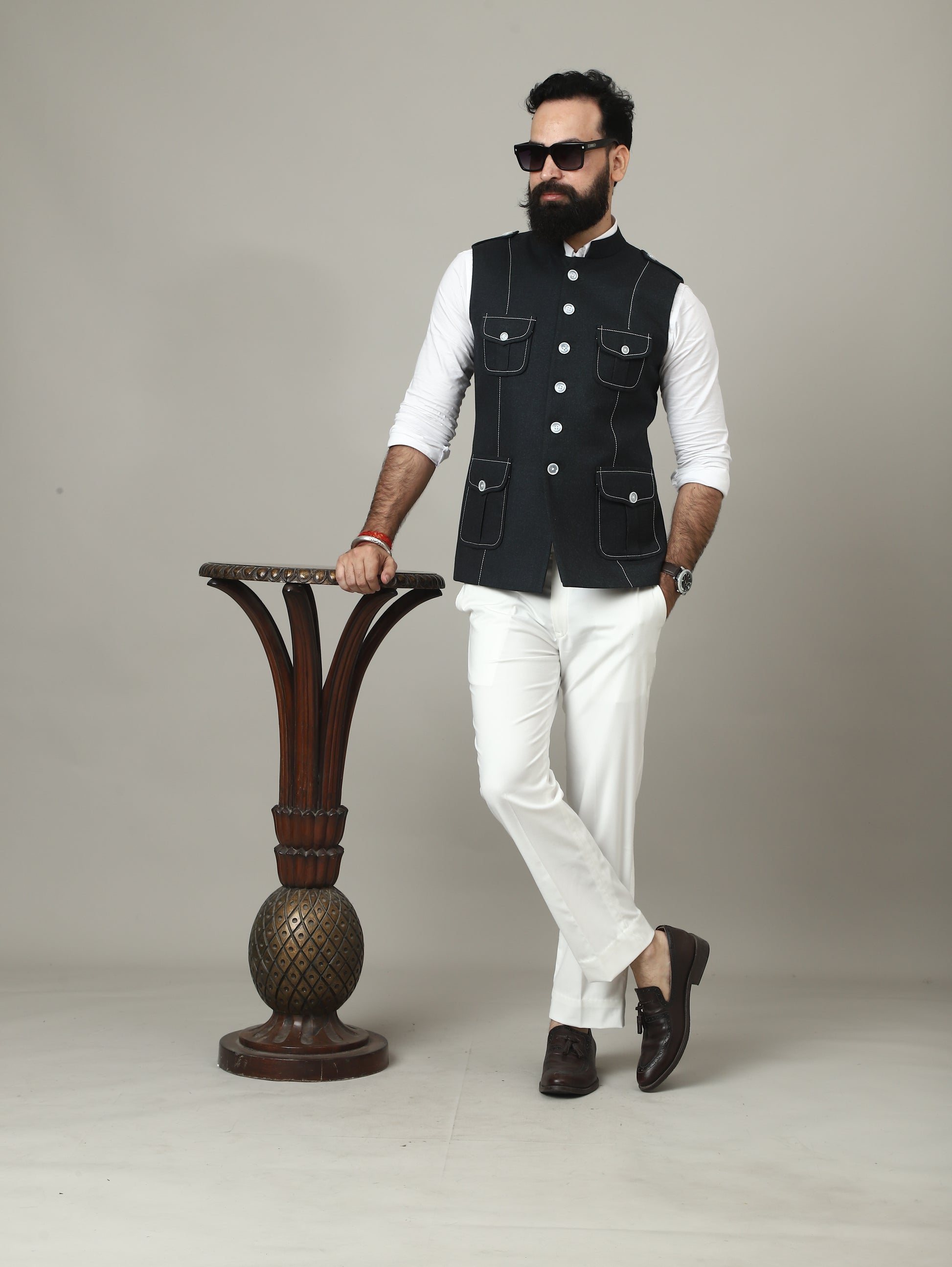 The matte black textured fabric forms the base, while the contrast white stitch detailing across the sculpted flap pockets adds definition and visual architecture. Shoulder epaulettes, a mandarin bandhgala collar, and polished silver-toned buttons complete a look that is equal parts luxury and authority.