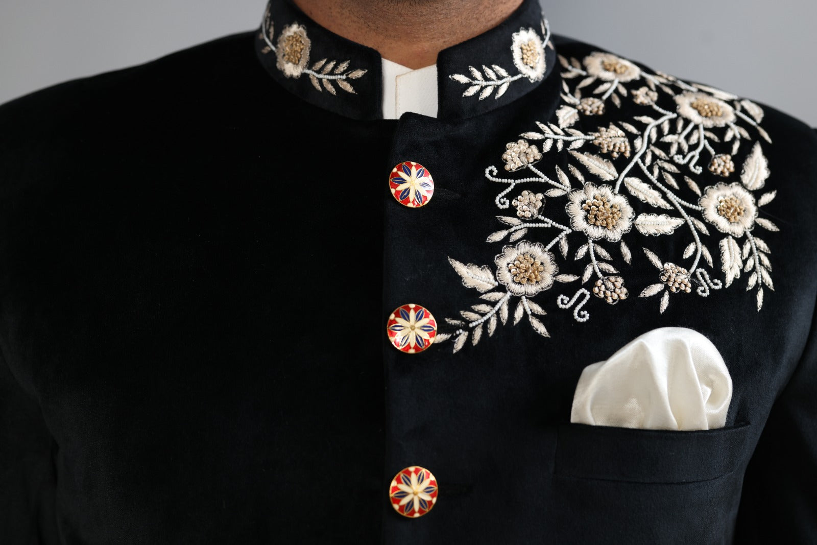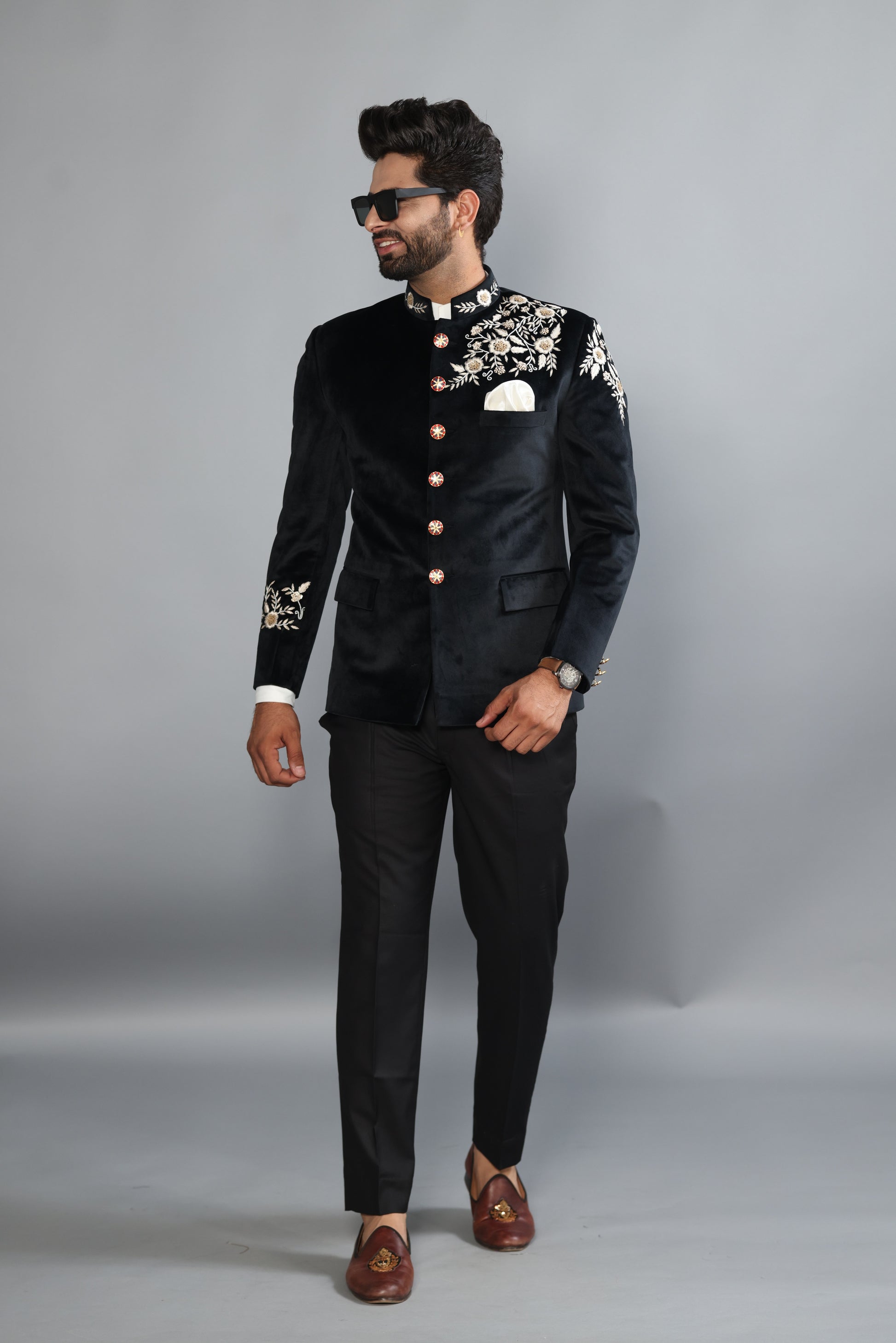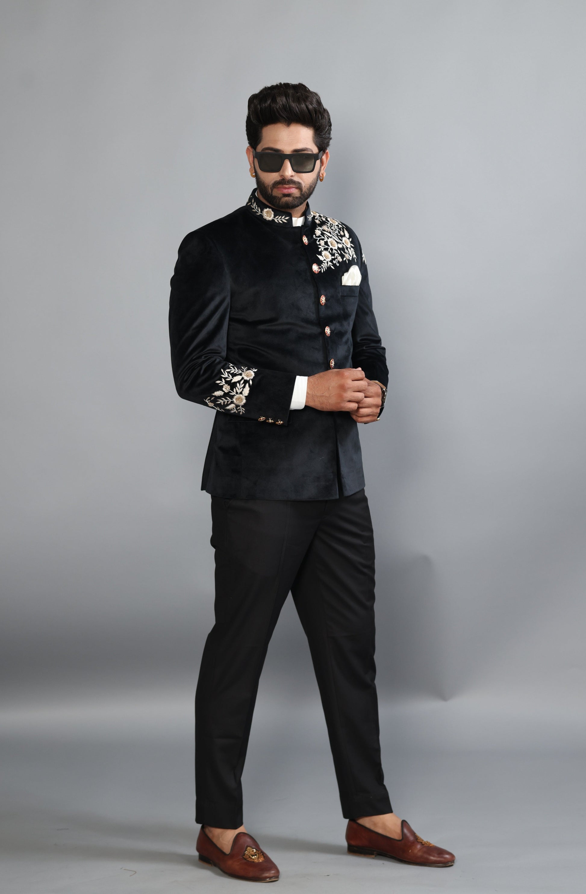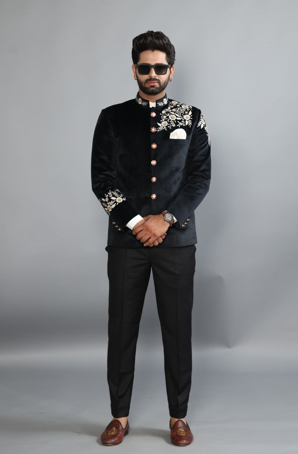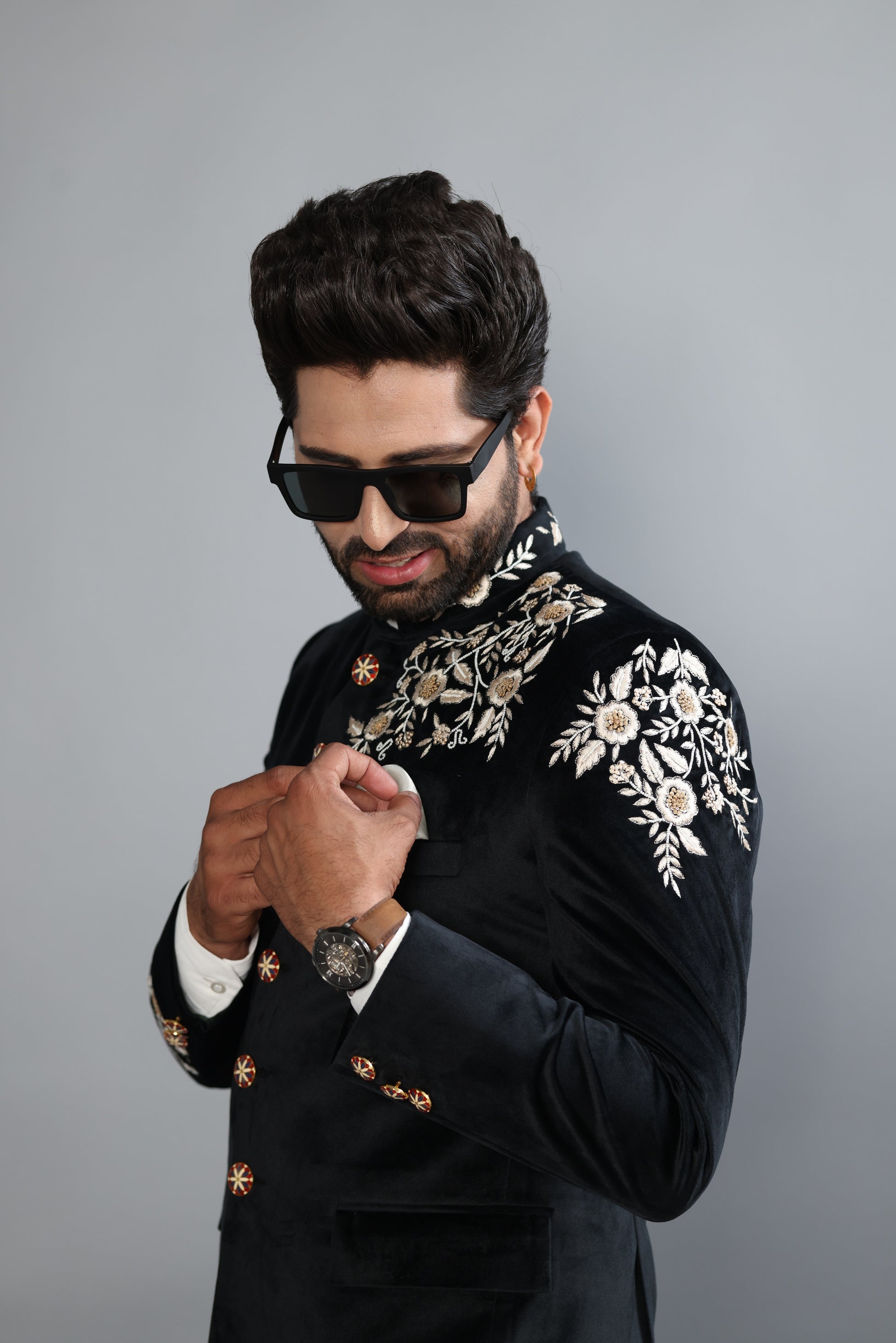 Black Velvet Bandh gala with Hand Floral Threadwork with Black Trouser