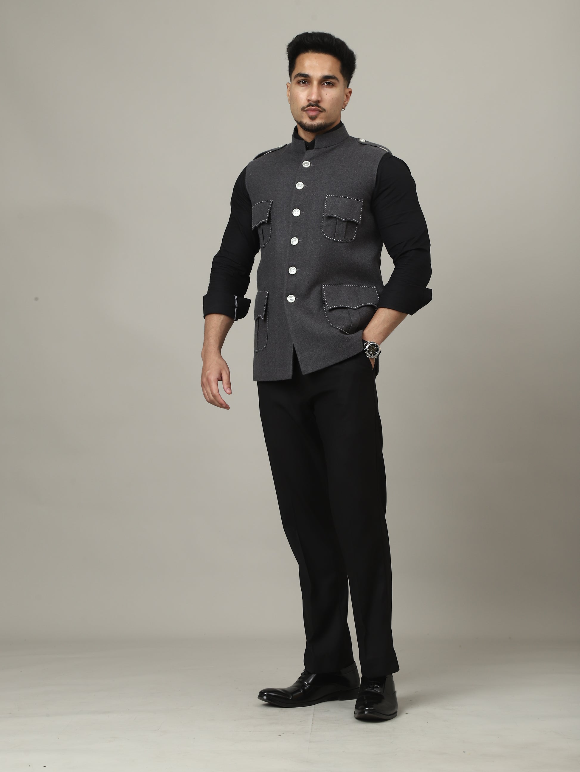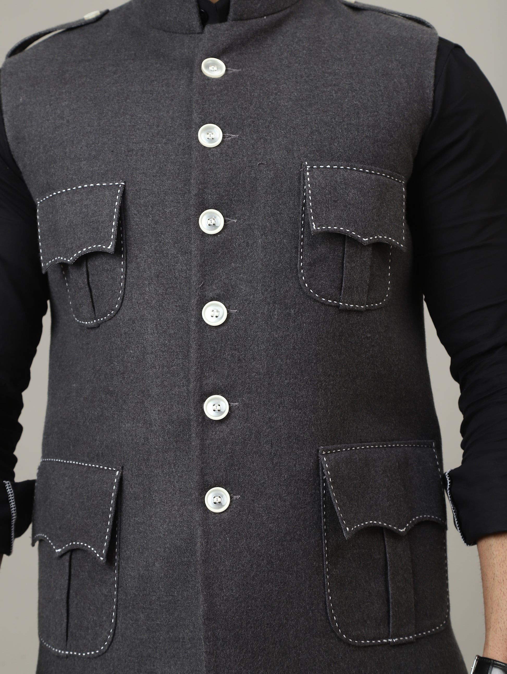 The design features four sculpted flap pockets enhanced with contrast thread detailing, adding character without compromising sophistication. The strong shoulder line, mandarin collar, and polished buttons give the waistcoat a powerful stance — ideal for weddings, festive gatherings, and curated evening wear.