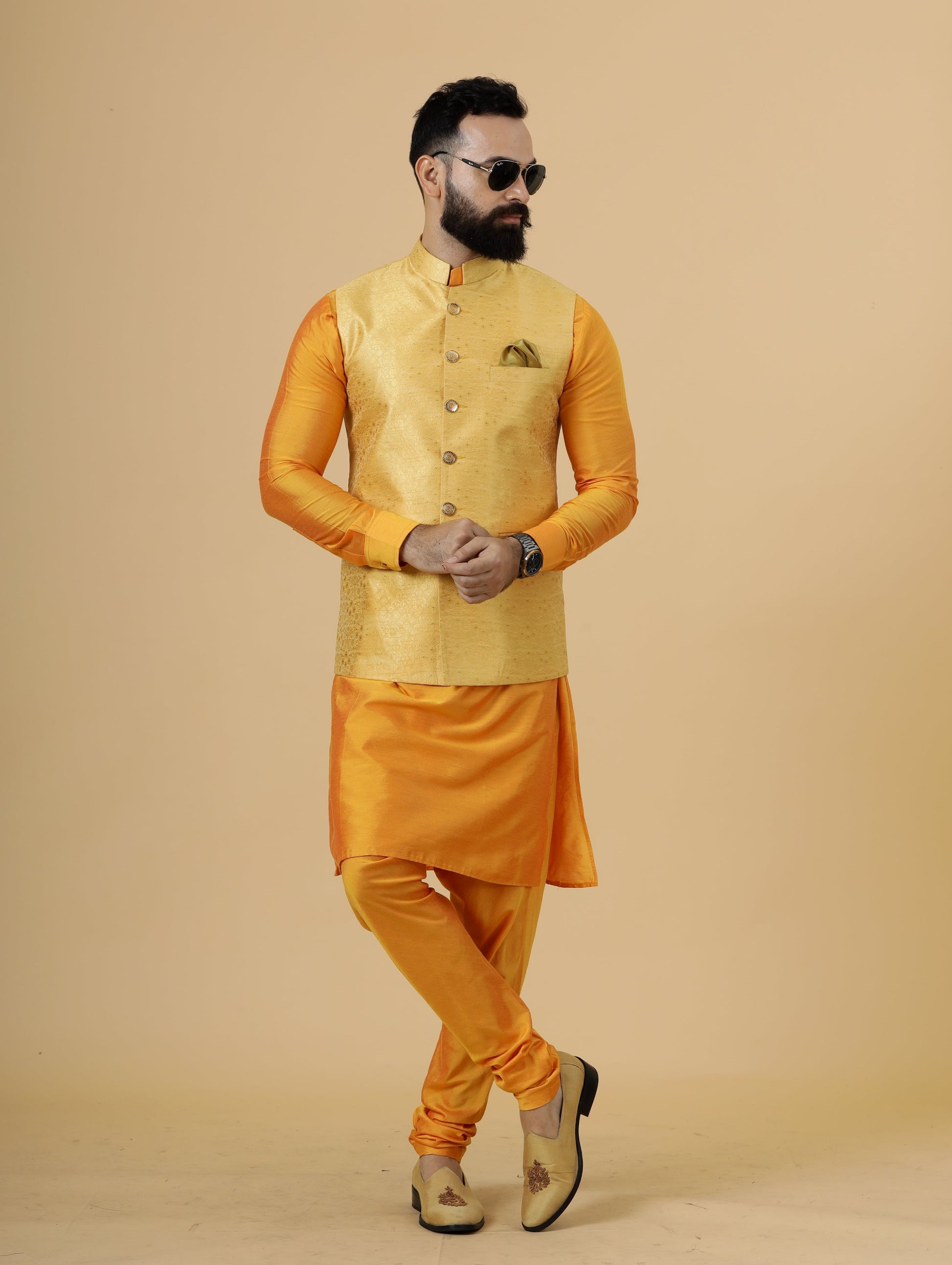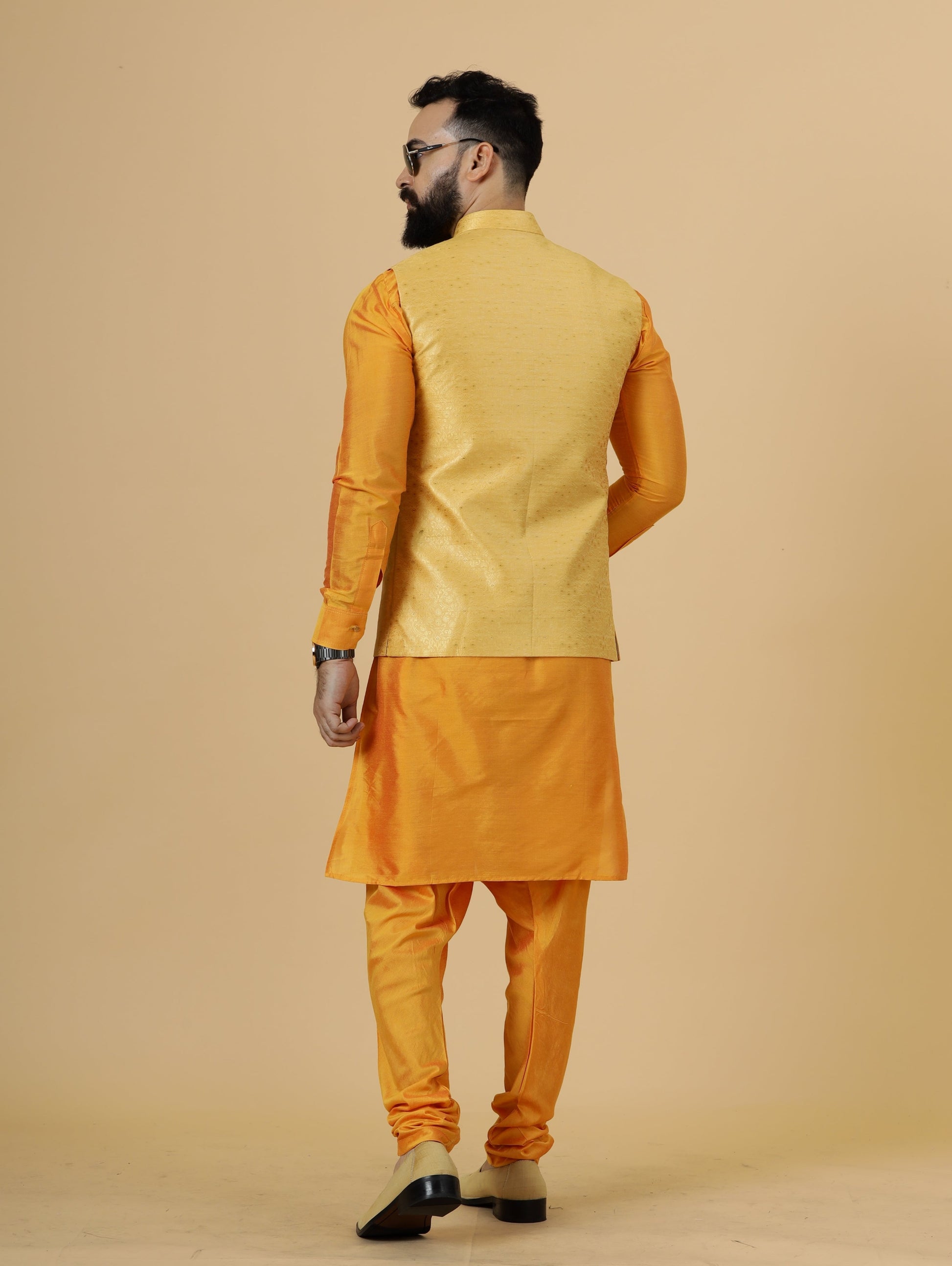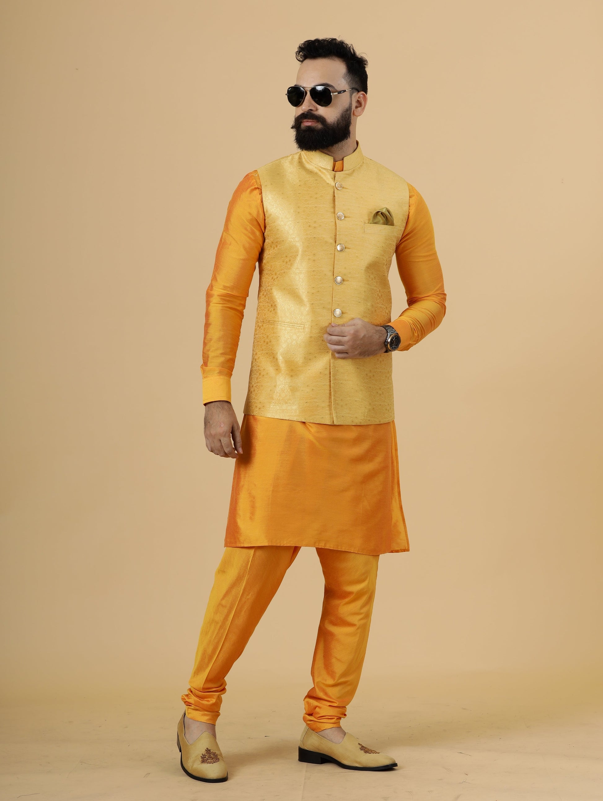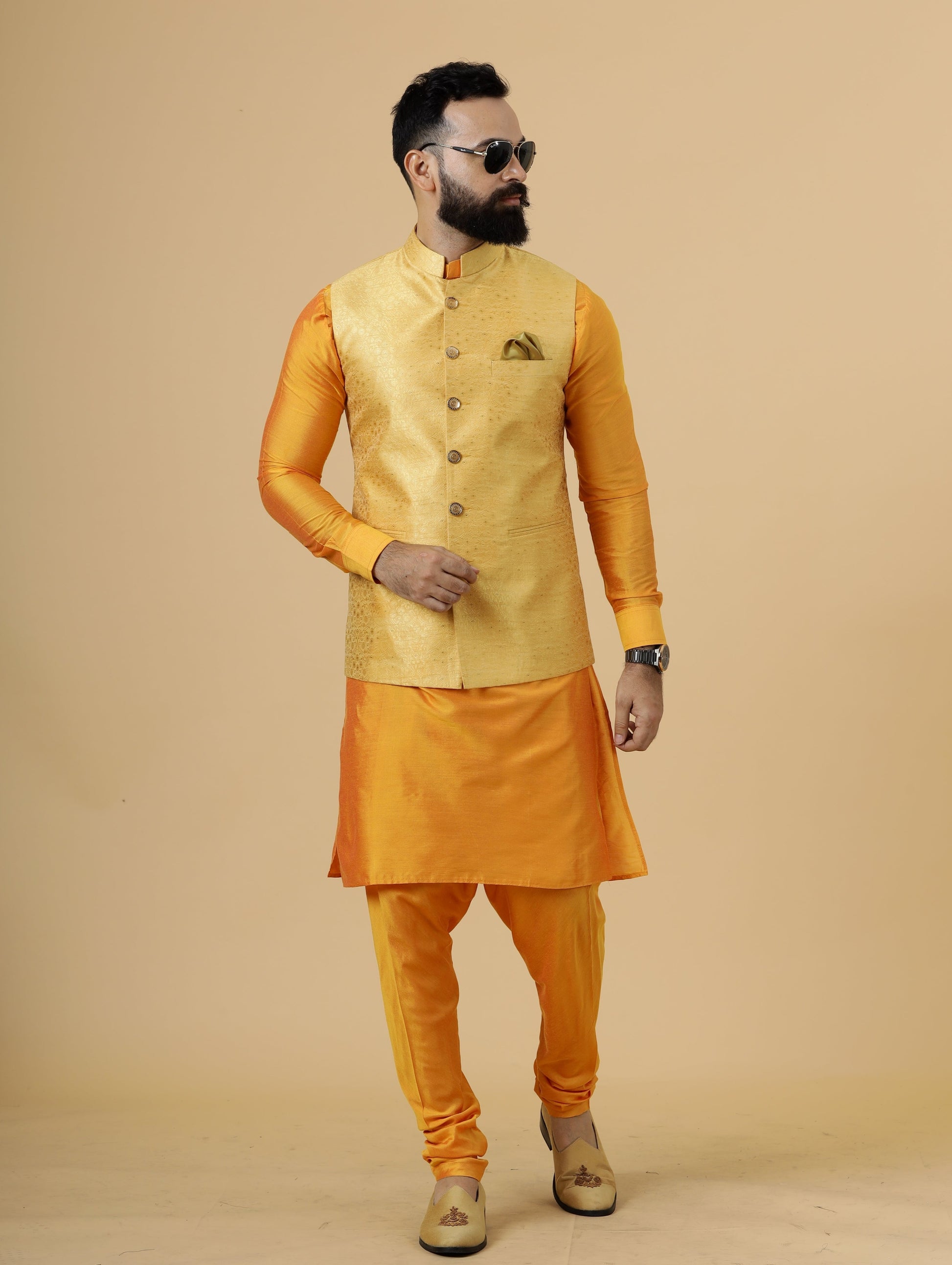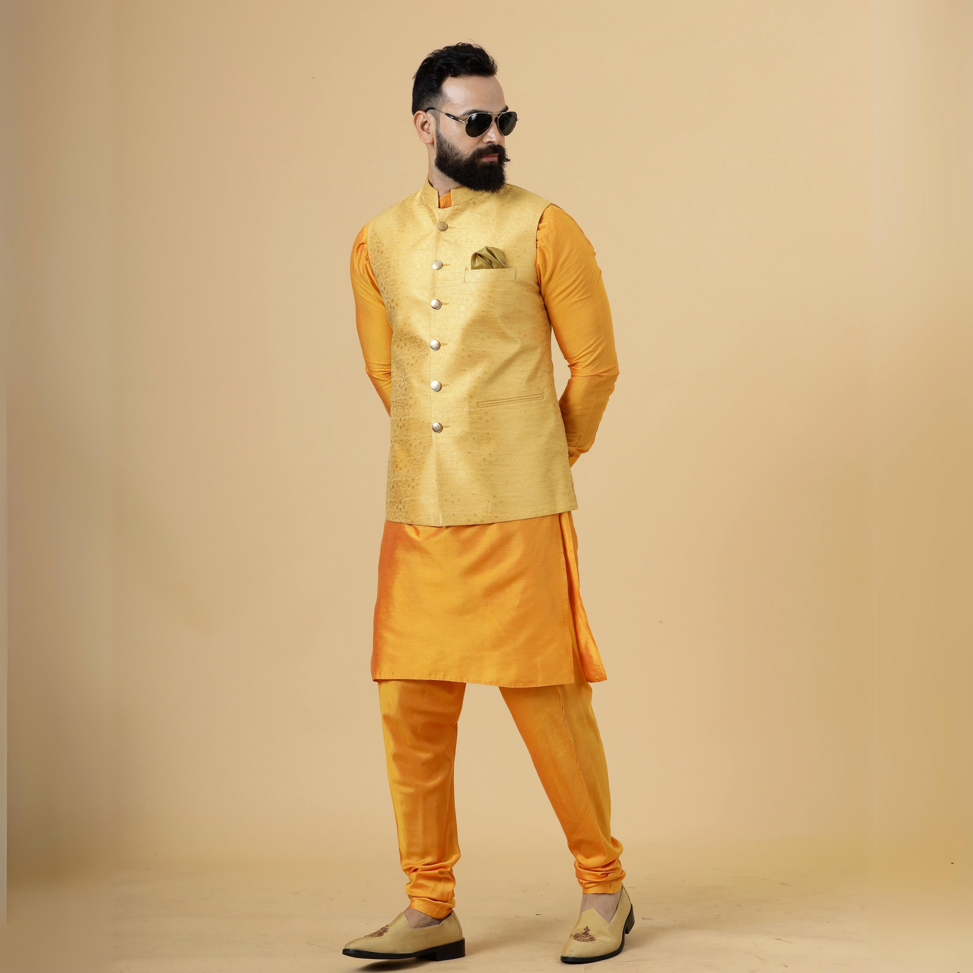 • Color: Yellow Half Jacket, Marigold Kurta-Pajama