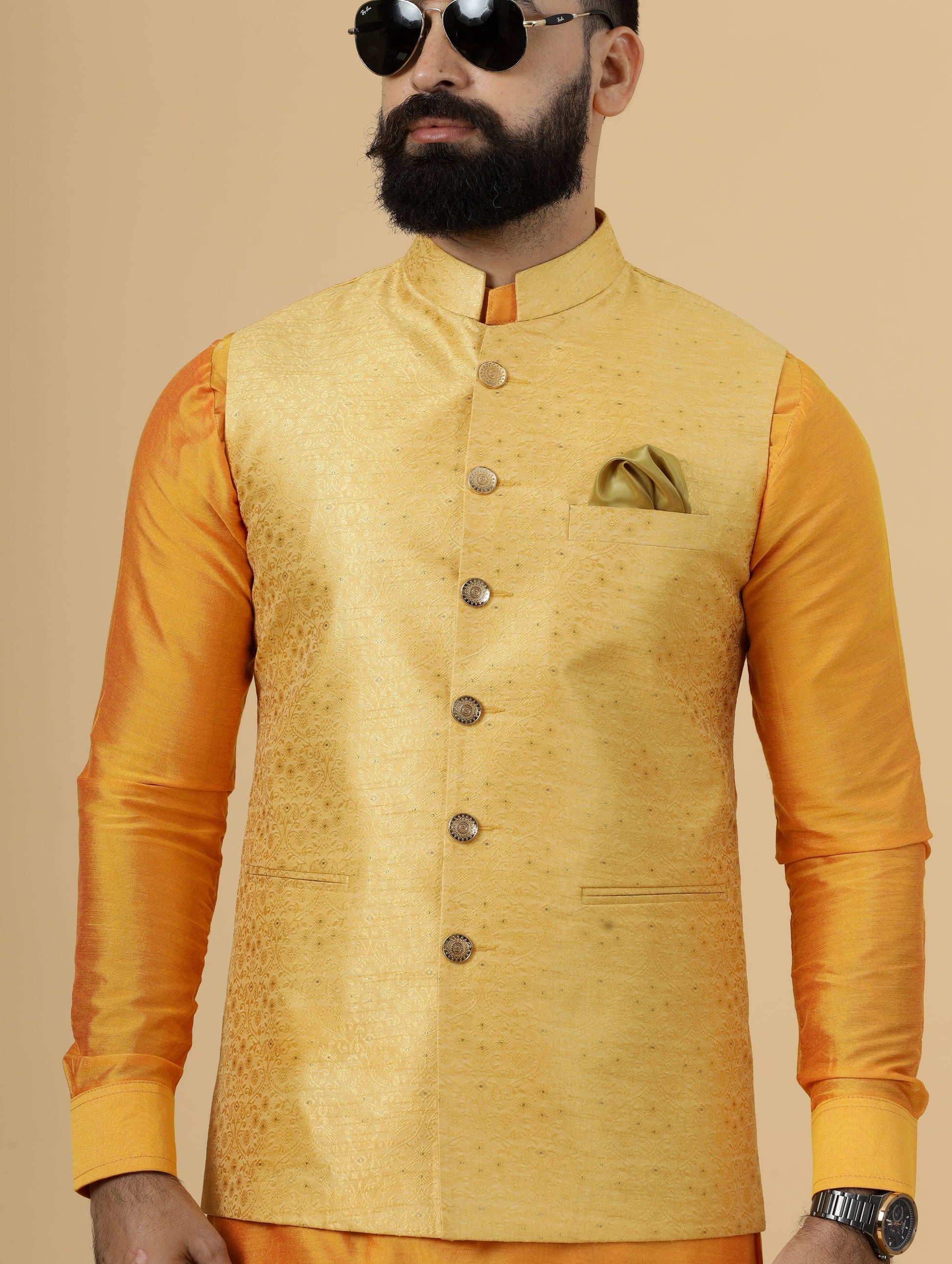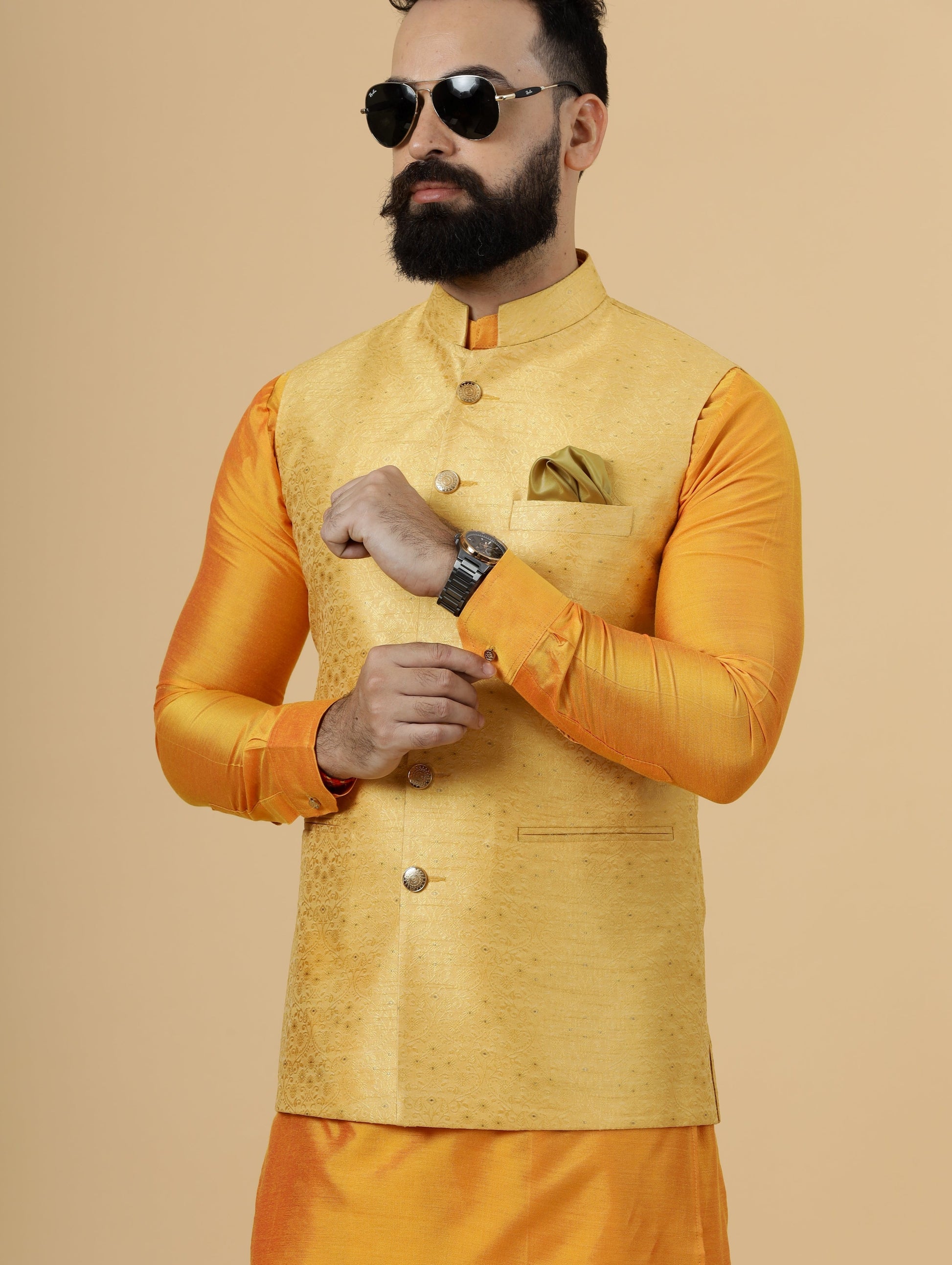 Classic Yellow Brocade Silk Half Jodhpuri Jacket with Marigold Kurta-Pajama for Men