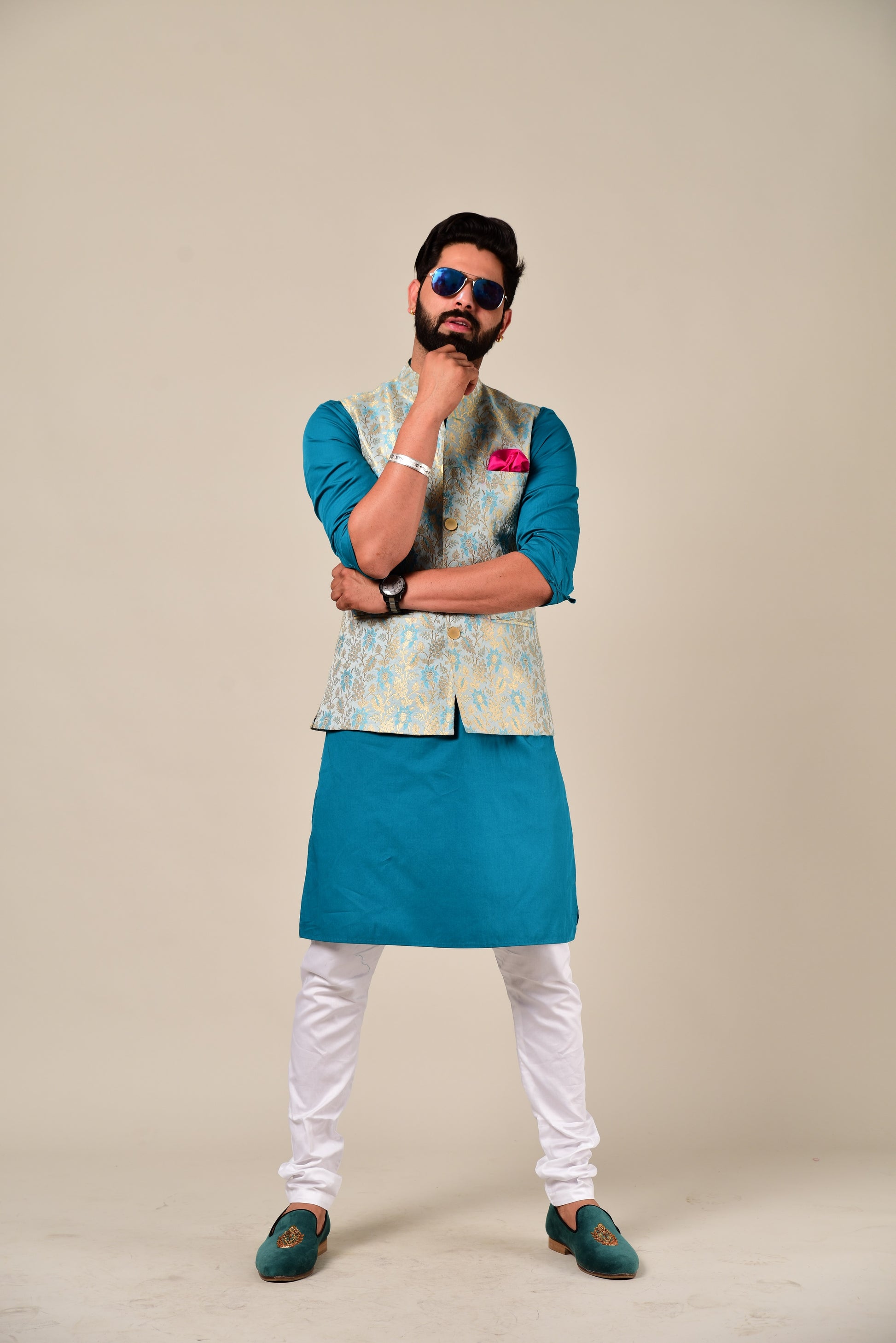 • Color: Cyan Blue Half Jacket, Blue Kurta, White Pajama