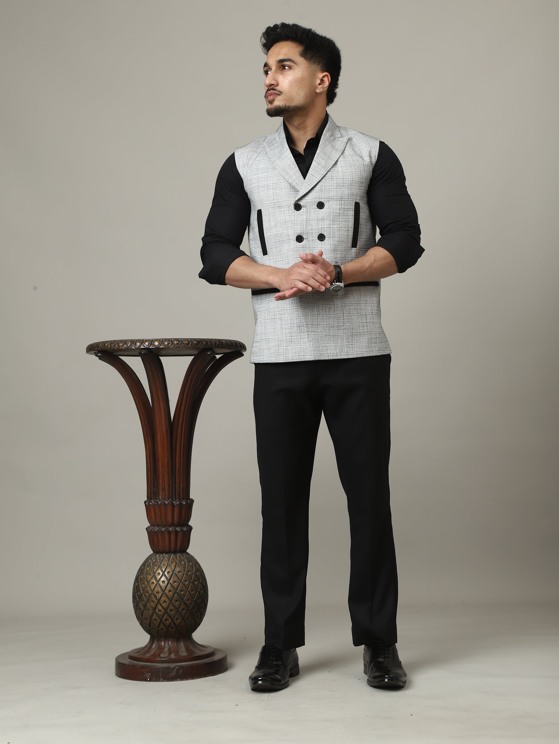 Minimal, refined, and distinctly elegant — the Ice Grey Double-Breasted Bandhgala Half-Jacket is designed for men who appreciate timeless tailoring with a modern luxury finish. The sharp double-breasted front, clean V-shaped neckline, and structured silhouette create a sophisticated look perfect for elevated celebration dressing.