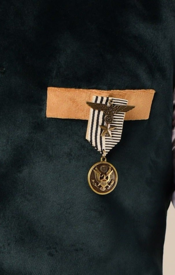 Modishly Styled Puff Pocket Green Velvet Nehru Jacket with White Kurta Pajama