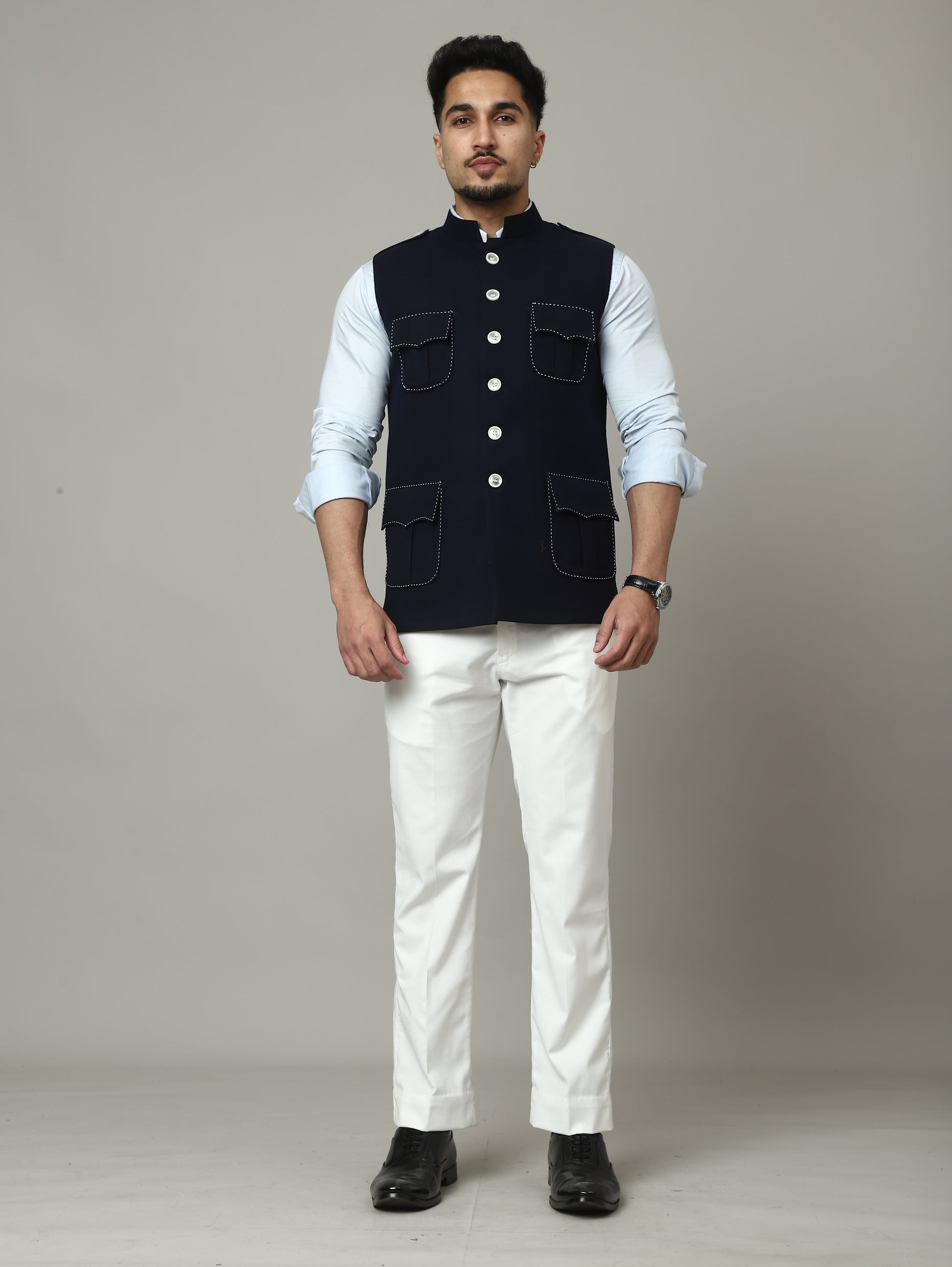 The deep navy tone offers a polished alternative to black, while the contrast stitch detailing across the sculpted flap pockets adds depth and definition without overpowering the look. Completed with a mandarin bandhgala collar, premium metal buttons, and a strong structured fit — this waistcoat makes an effortless statement.