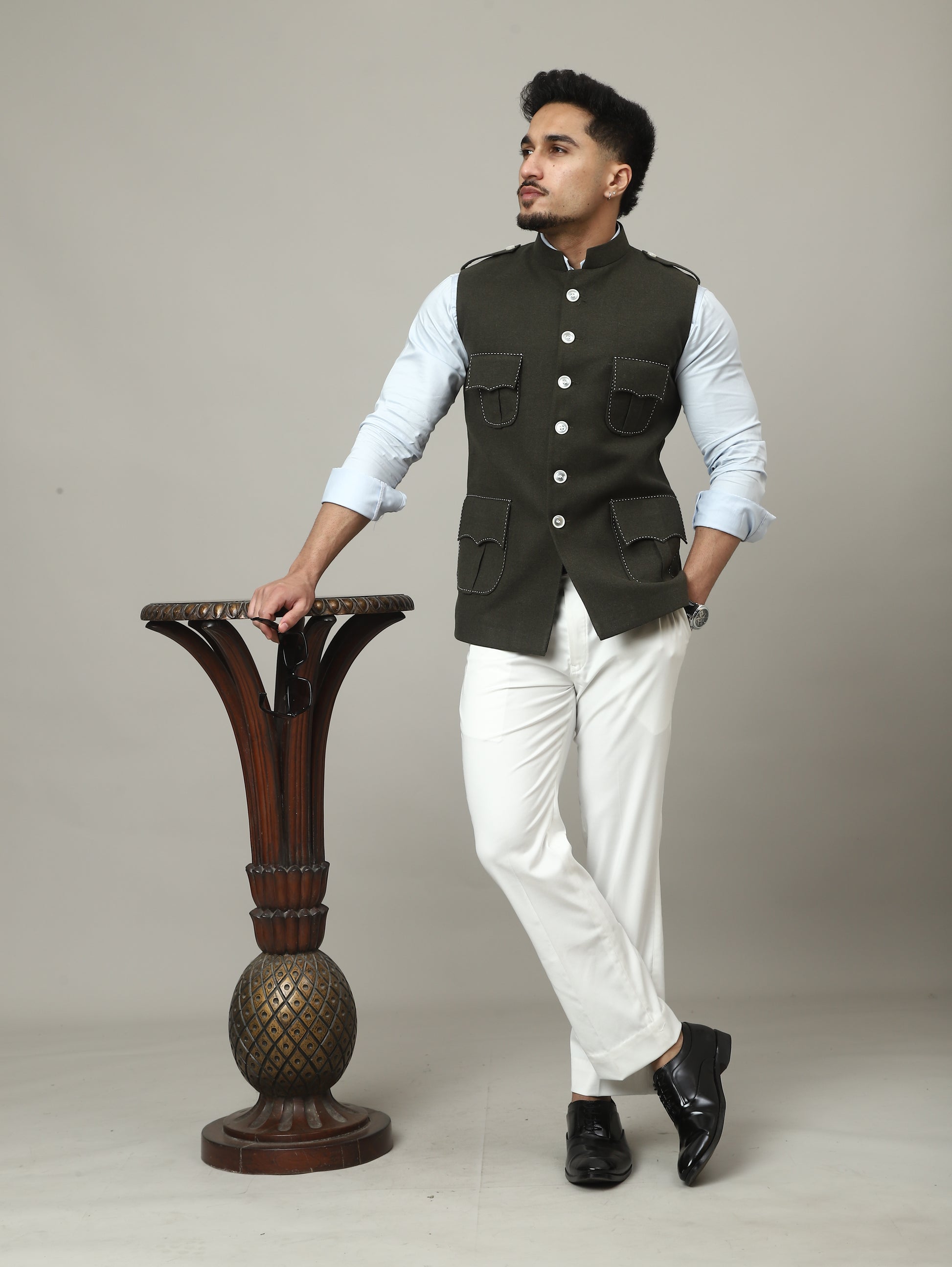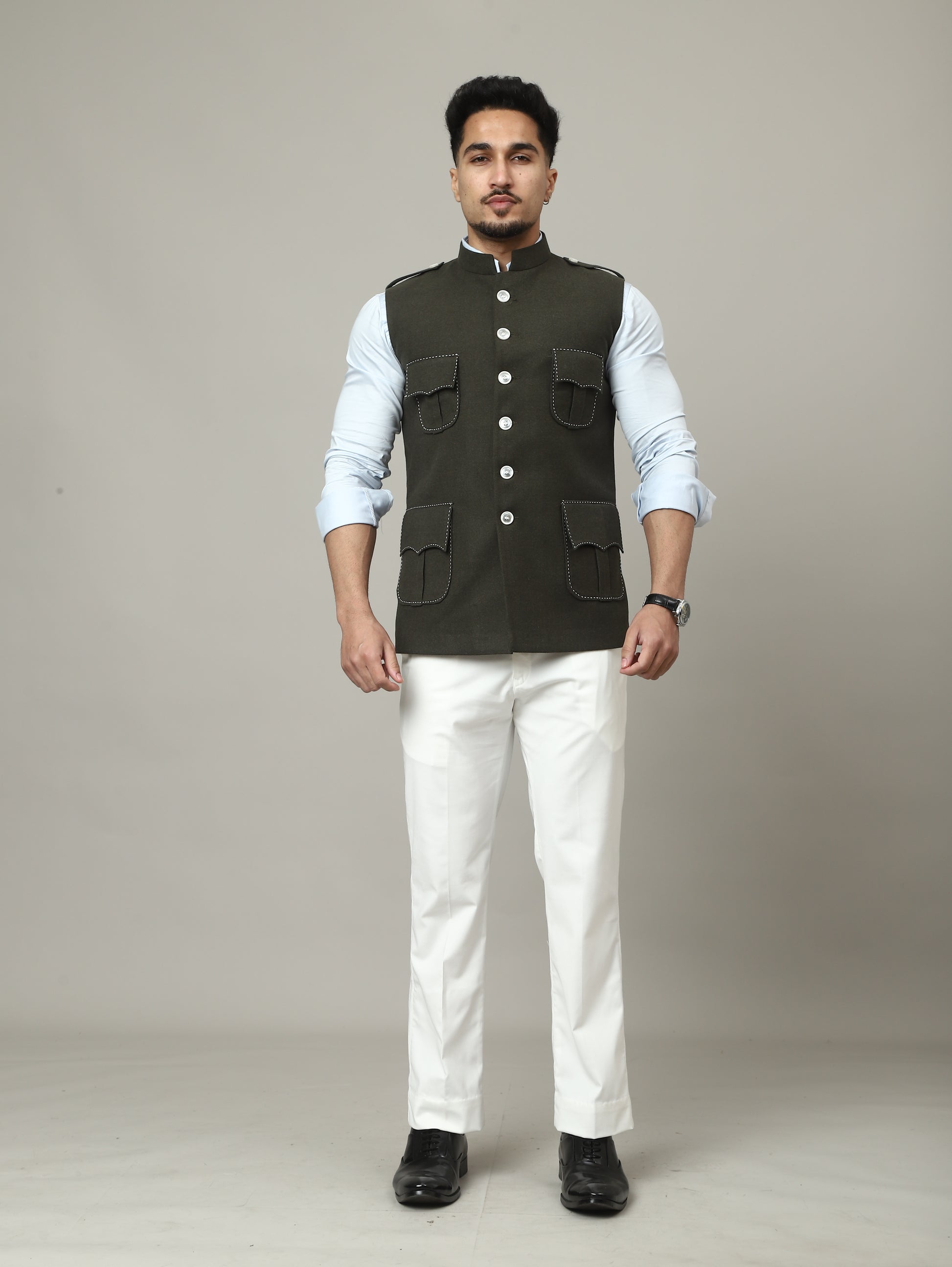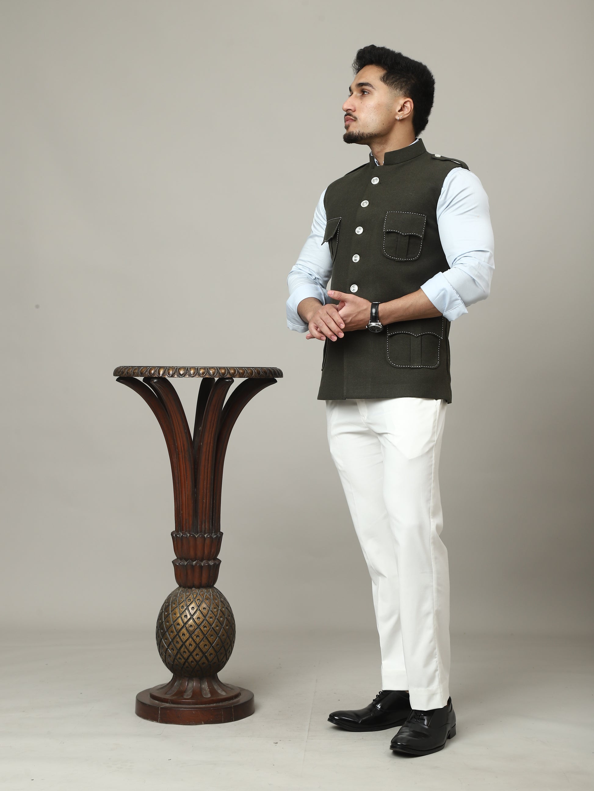 The deep olive tone offers versatility for both day and evening events, while the contrast stitch detailing across its sculpted flap pockets adds structure and visual identity. A mandarin bandhgala collar, polished metal buttons, and strong shoulder lines complete a look defined by confidence rather than excess.