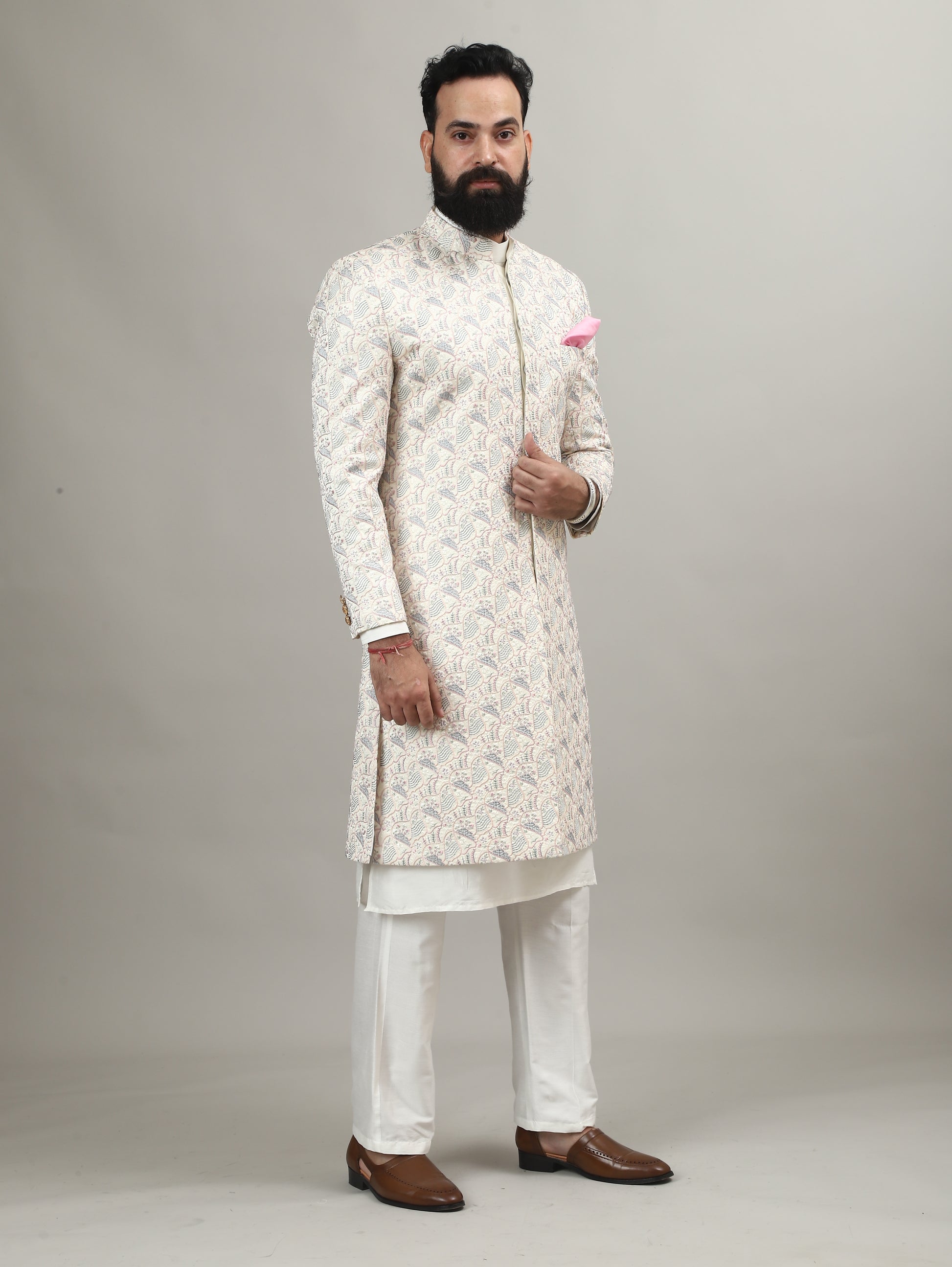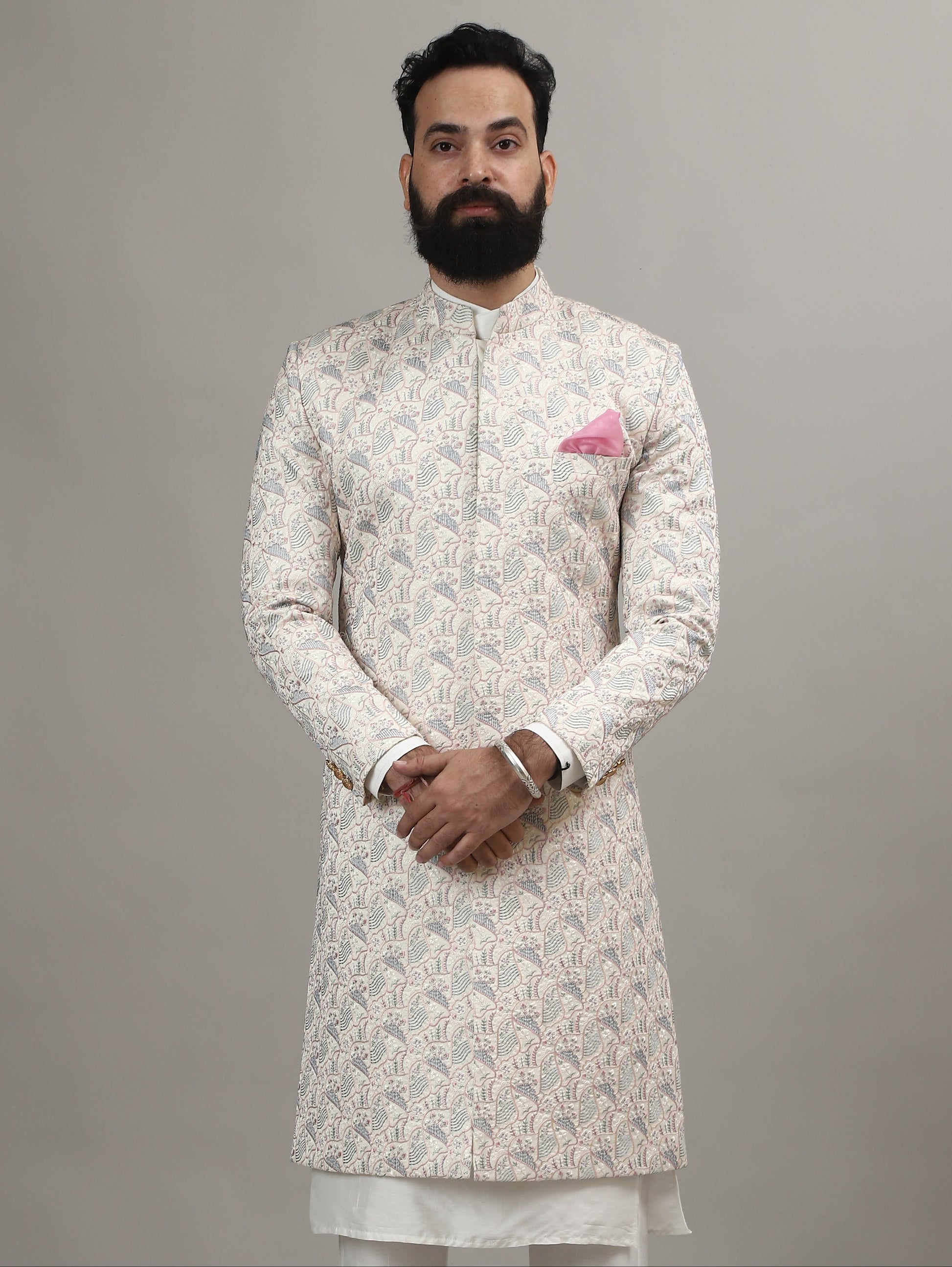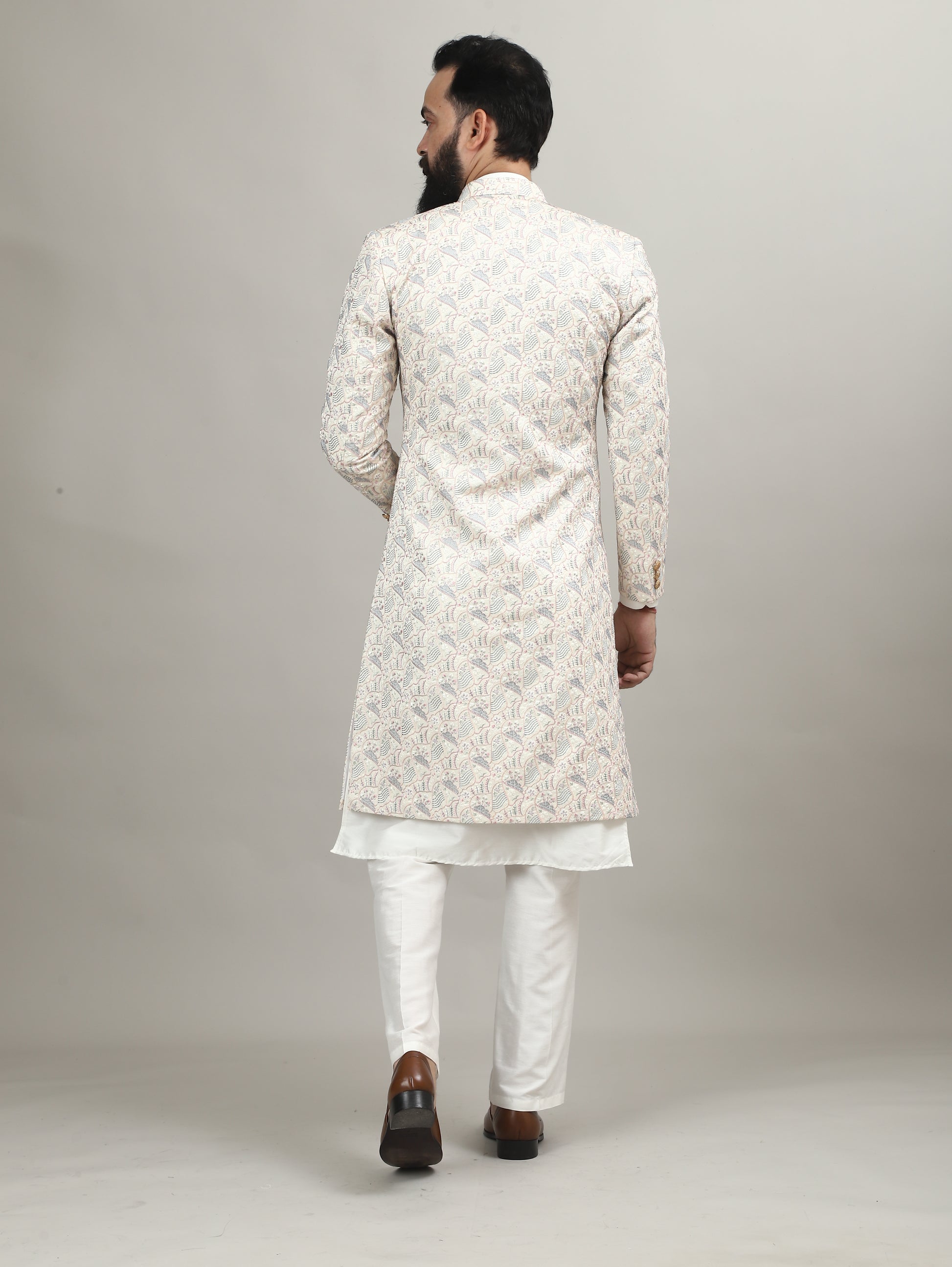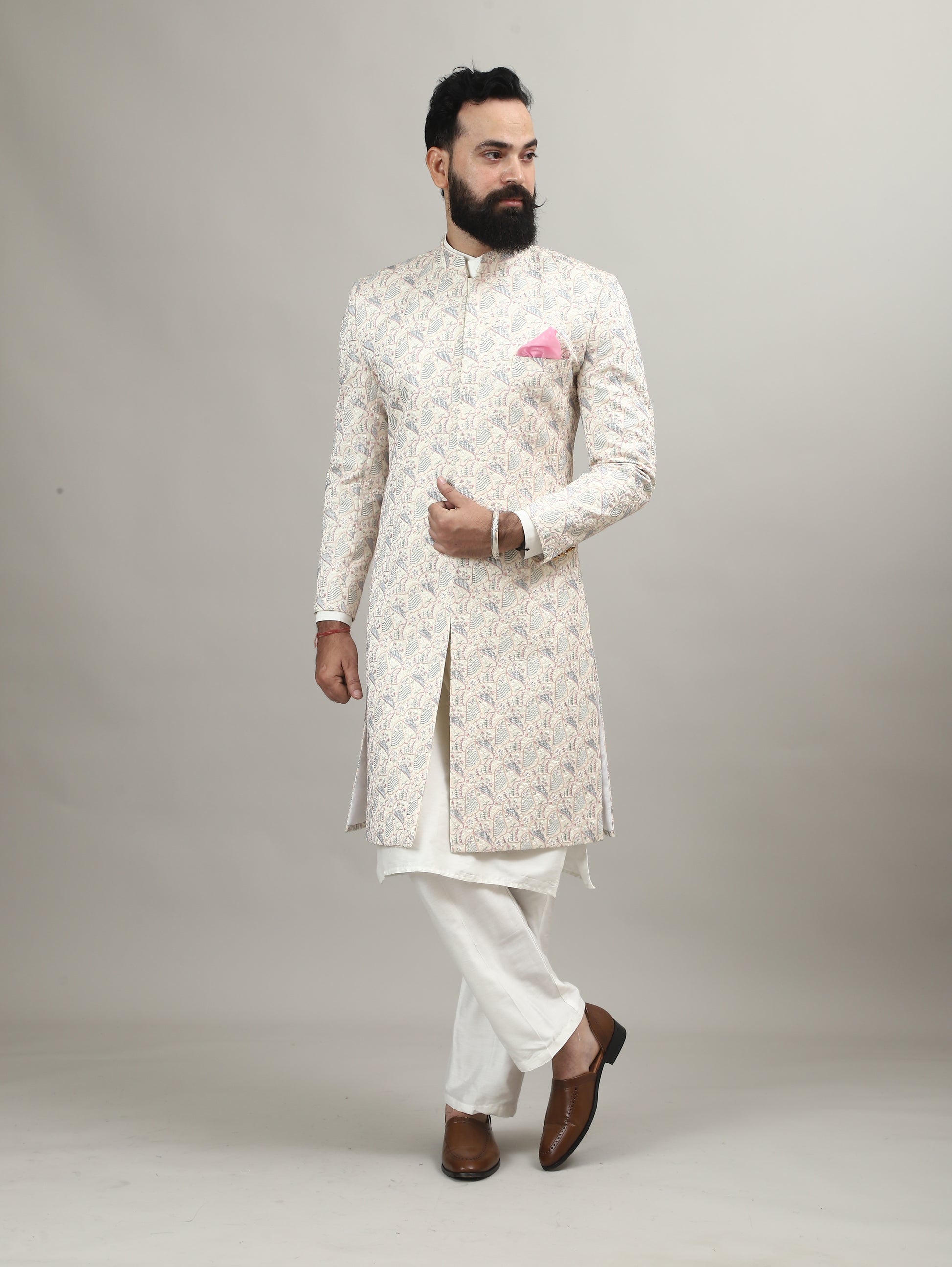 Designed in a structured sherwani silhouette, it offers a dignified presence ideal for weddings, pheras, receptions, and heritage celebrations. The soft pearl-white base with warm undertones pairs beautifully with ivory churidars, neutral stoles, or statement footwear, allowing effortless styling across occasions.