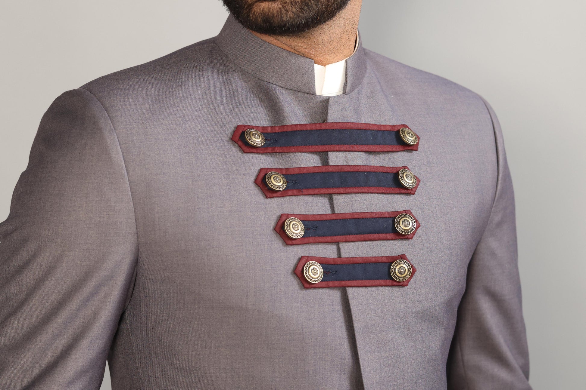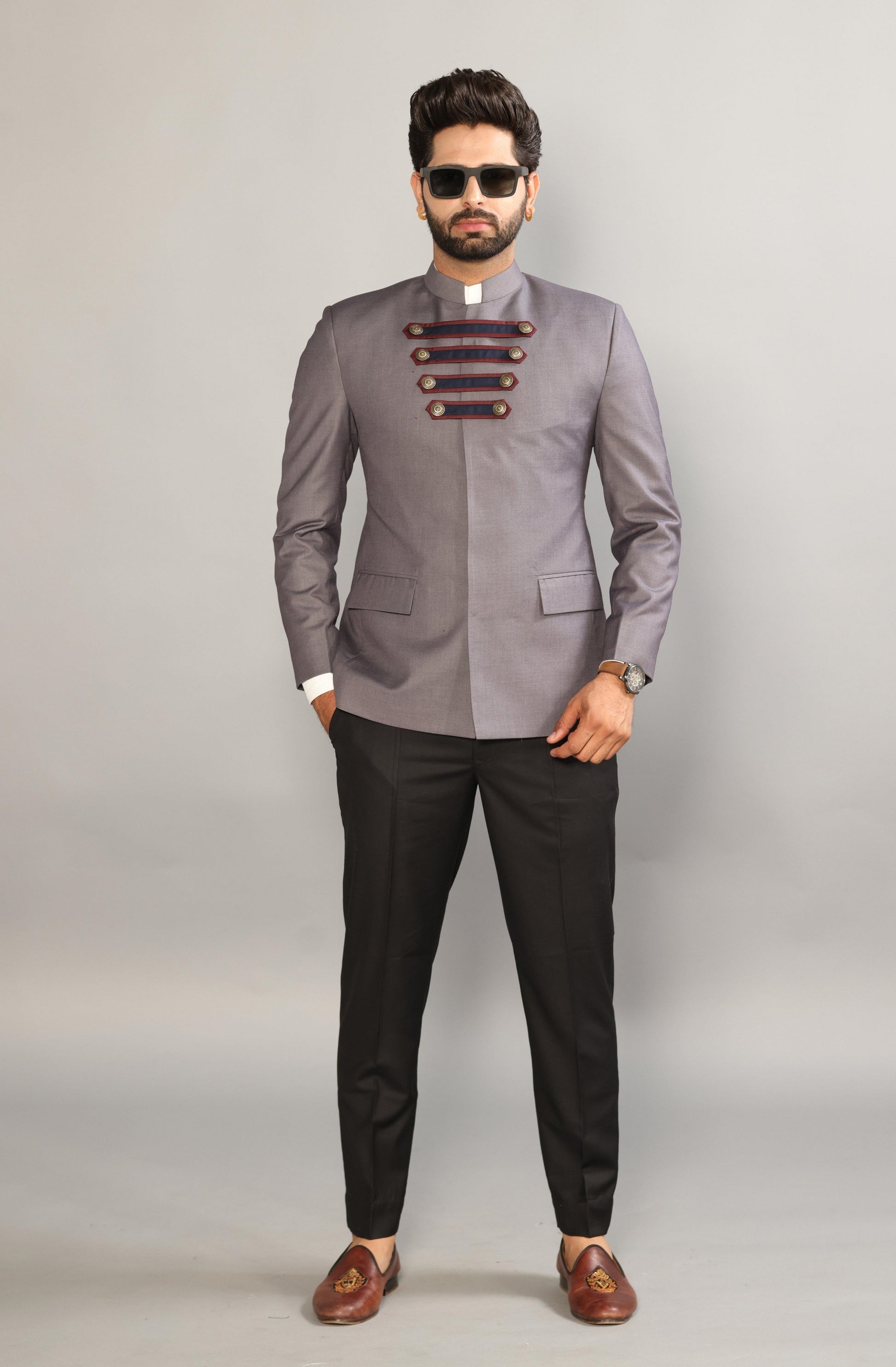 Silver Grey Jodhpuri Blazer with Strap Lock Pattern | Black Trouser |