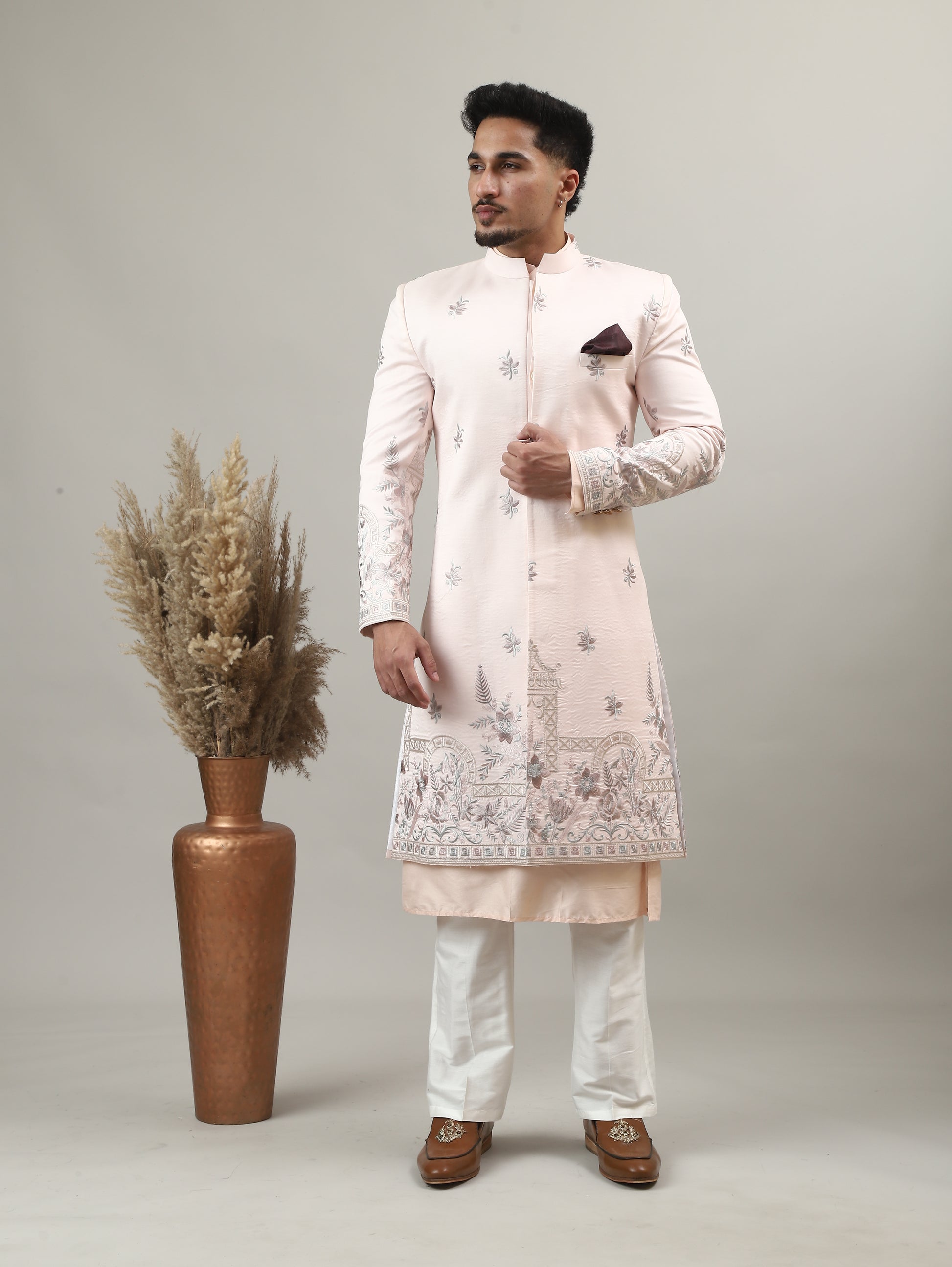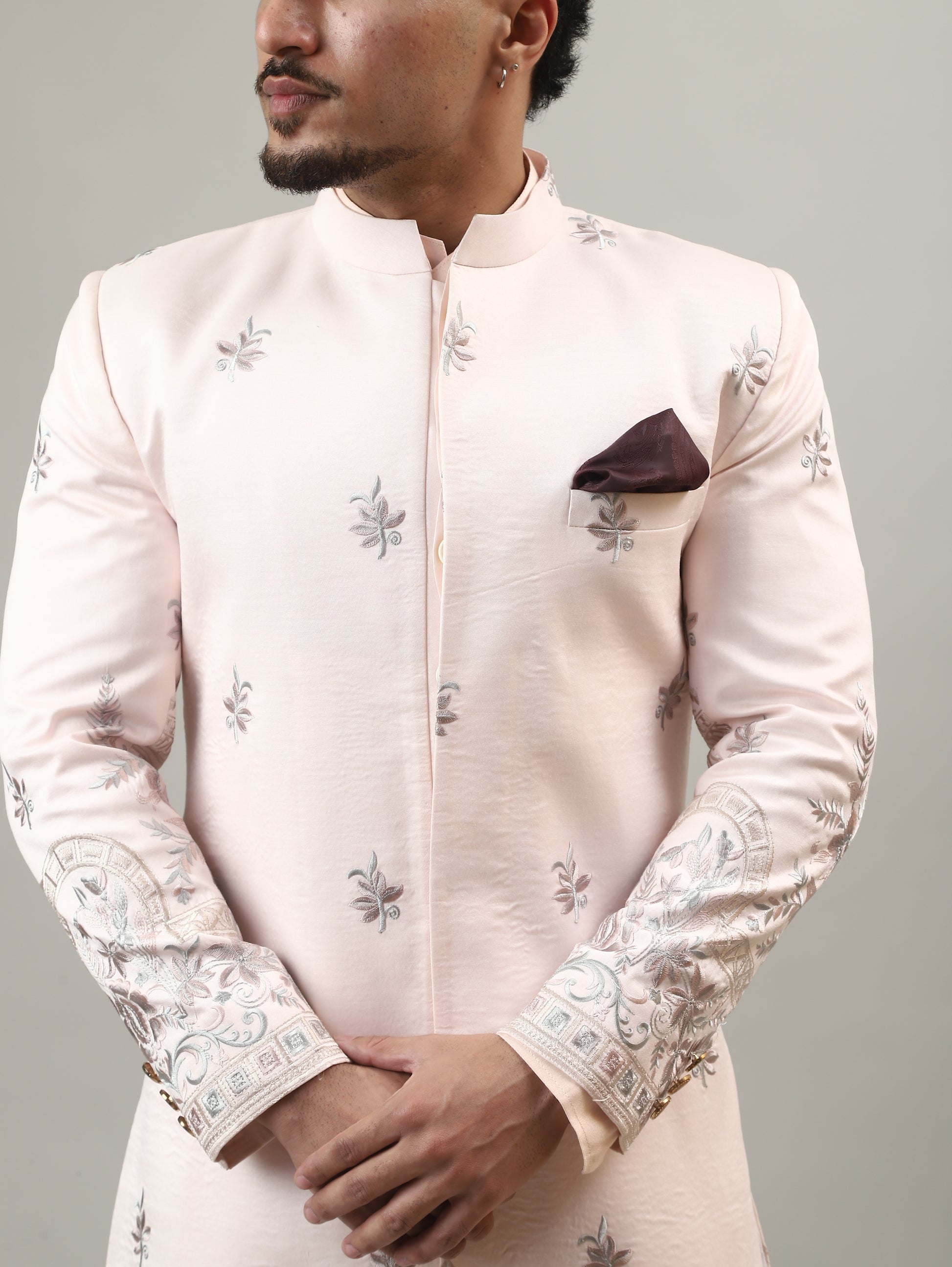 Soft Peach Embroidered Sherwani with Heritage Motif Detailing