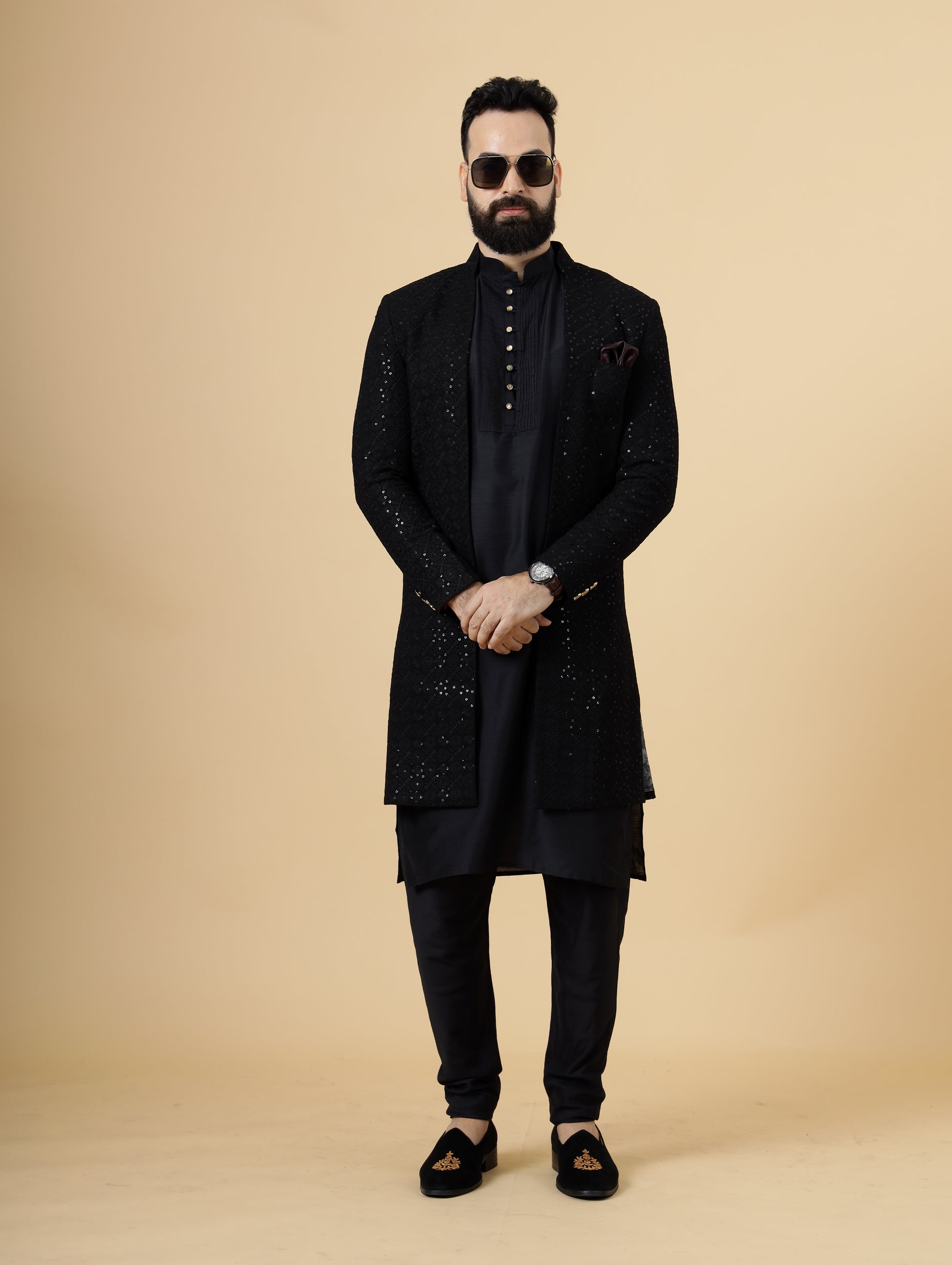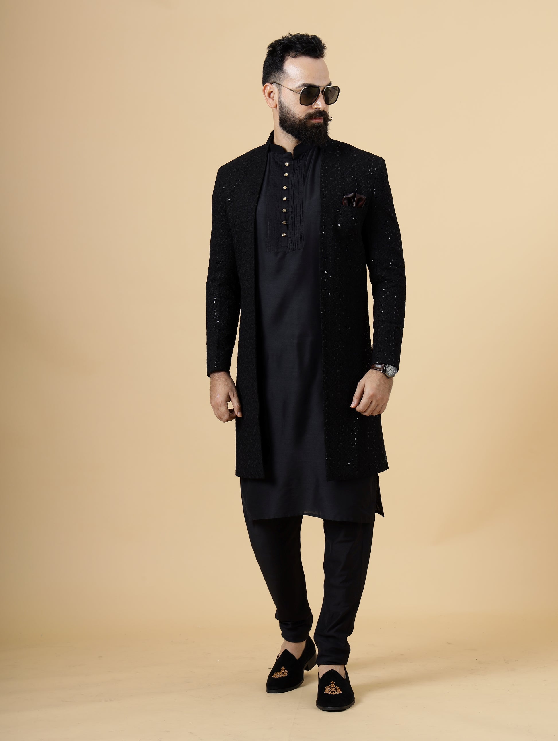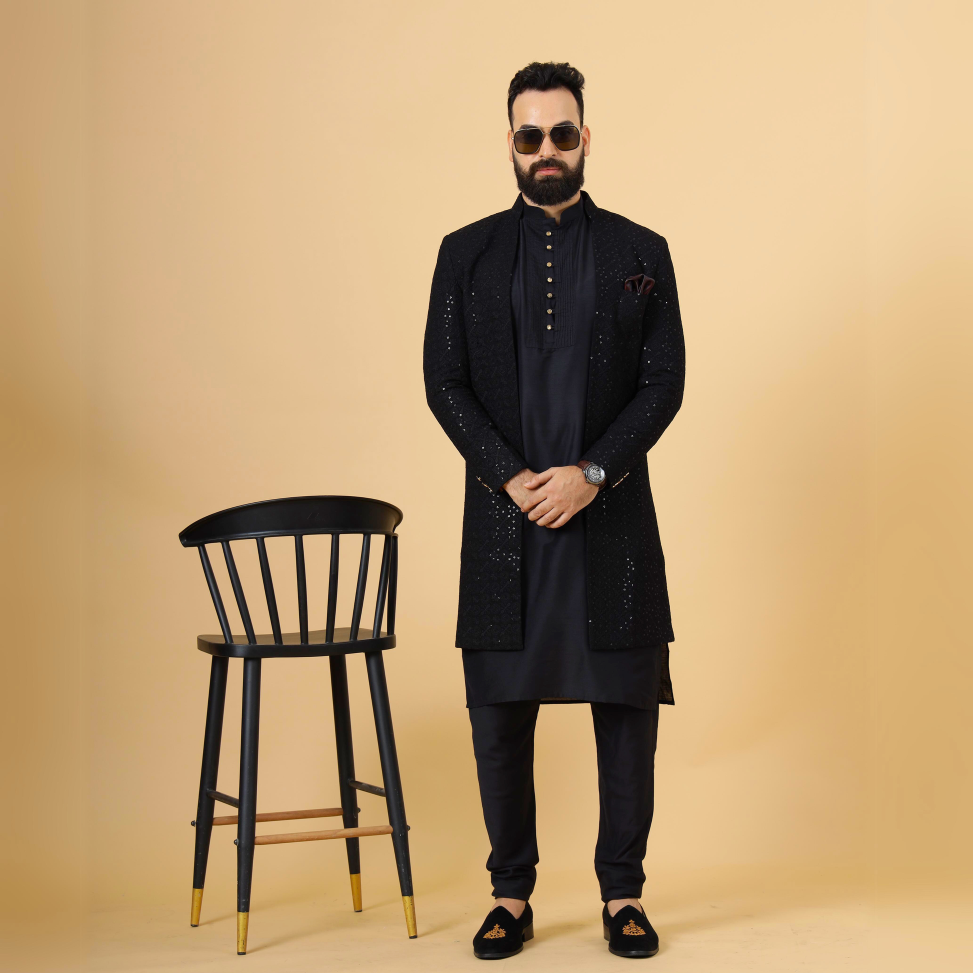 - Color: Sherwani: Black, Kurta: Black, Churidar: Black