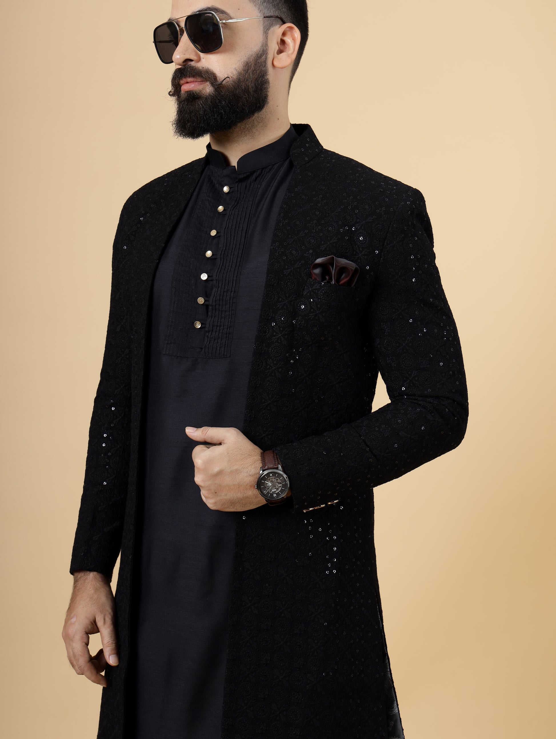 Color: Sherwani: Black, Kurta: Black, Churidar: Black