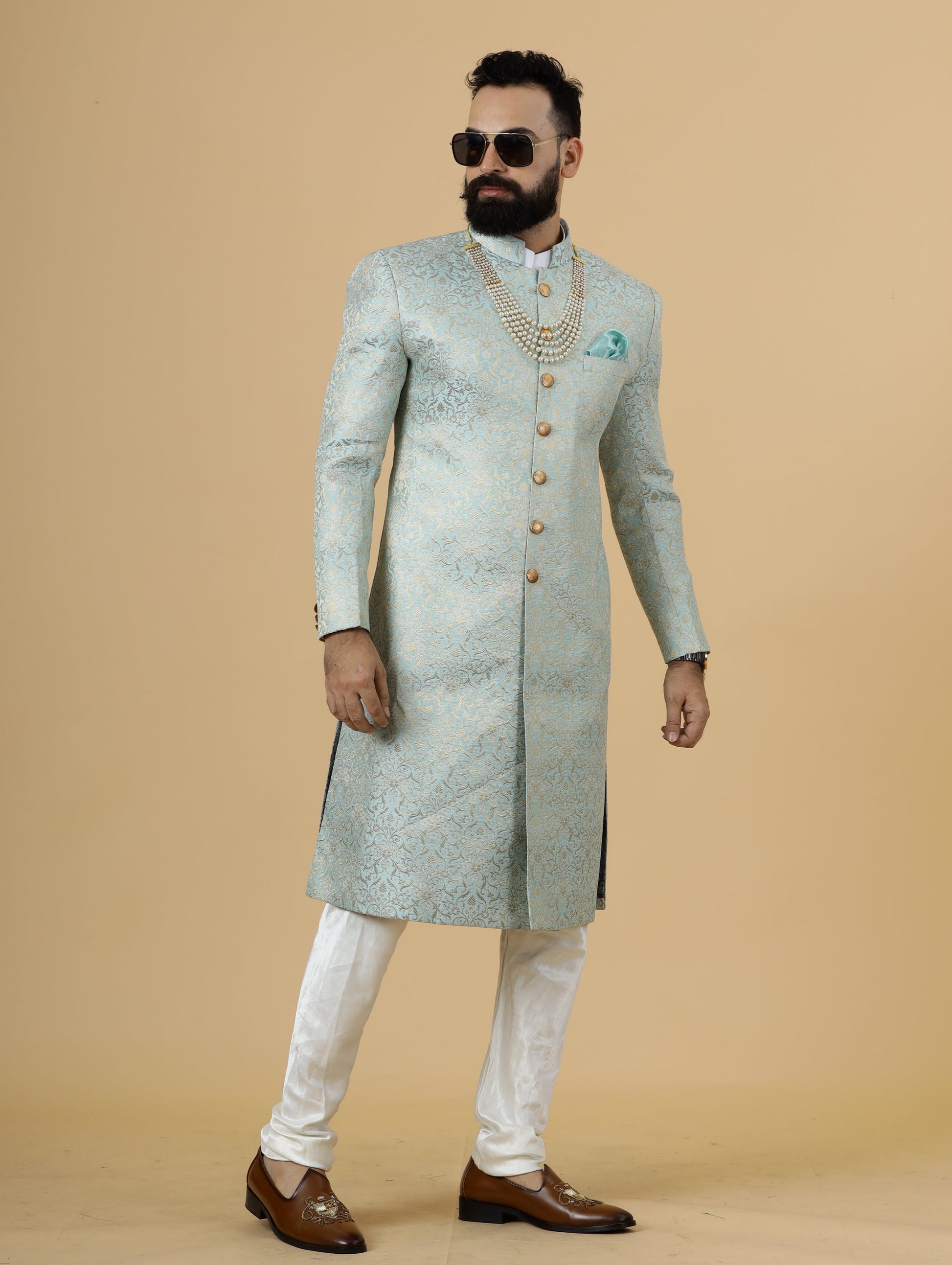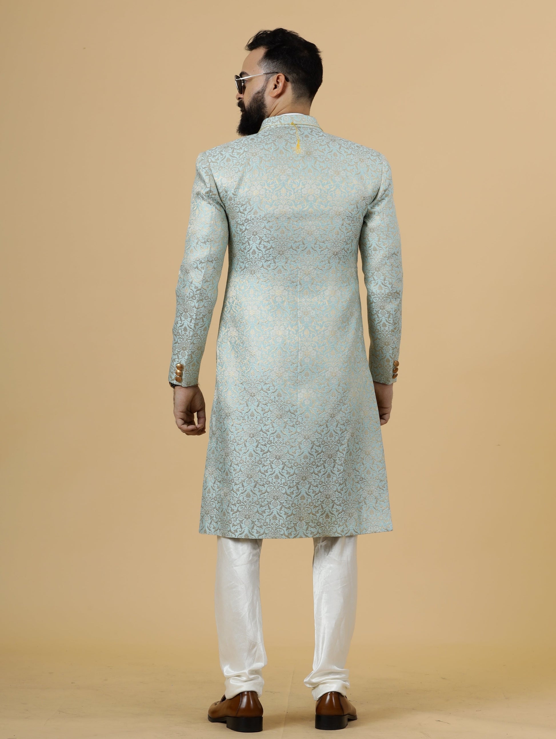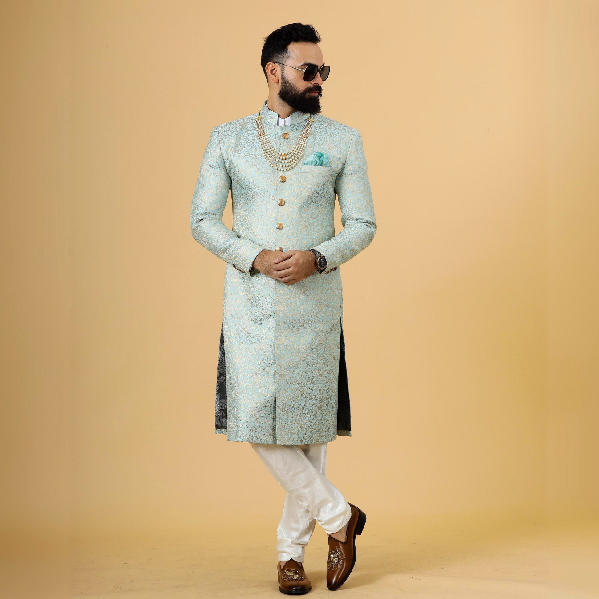 Stunning Sky Blue Banarasi Brocade Achkan for Men | Father Son Combo | Pastel Colour Sherwani | Perfect for Grooms