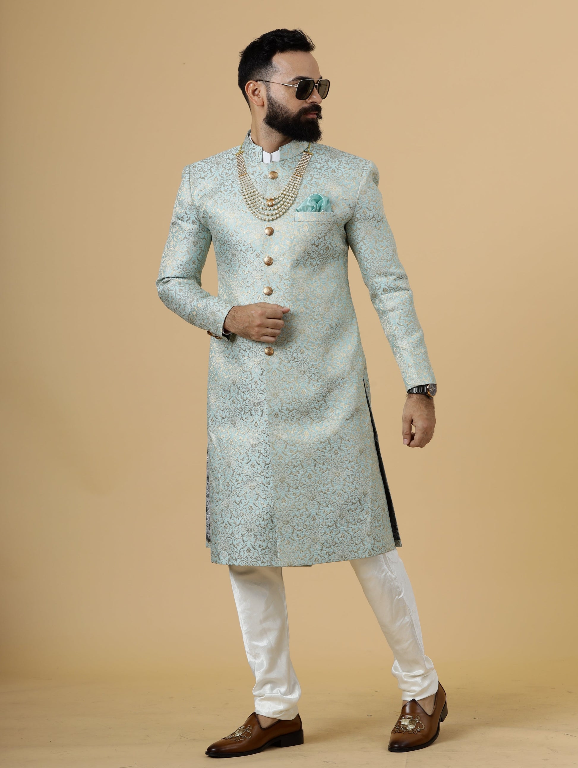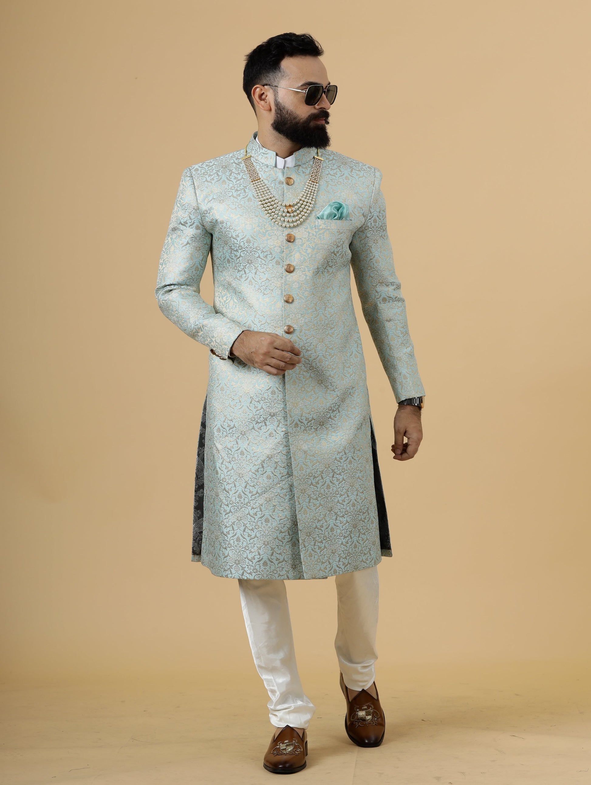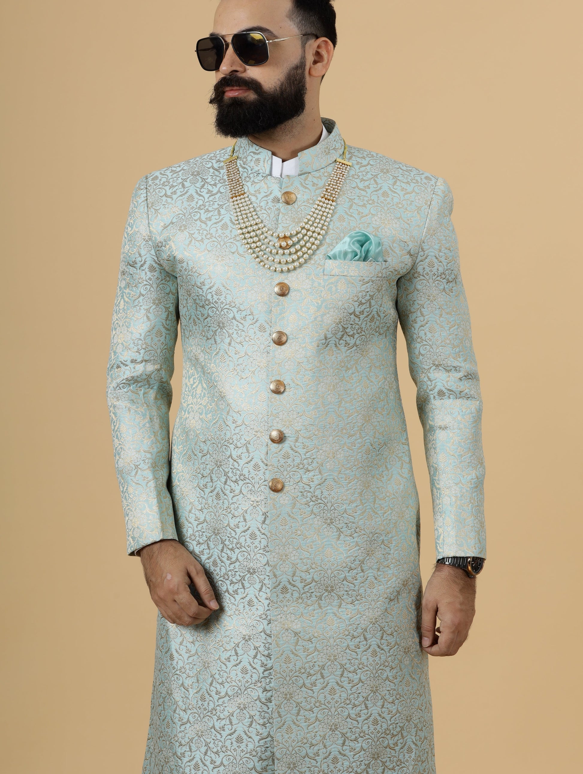 Stunning Sky Blue Banarasi Brocade Achkan for Men | Father Son Combo | Pastel Colour Sherwani | Perfect for Grooms