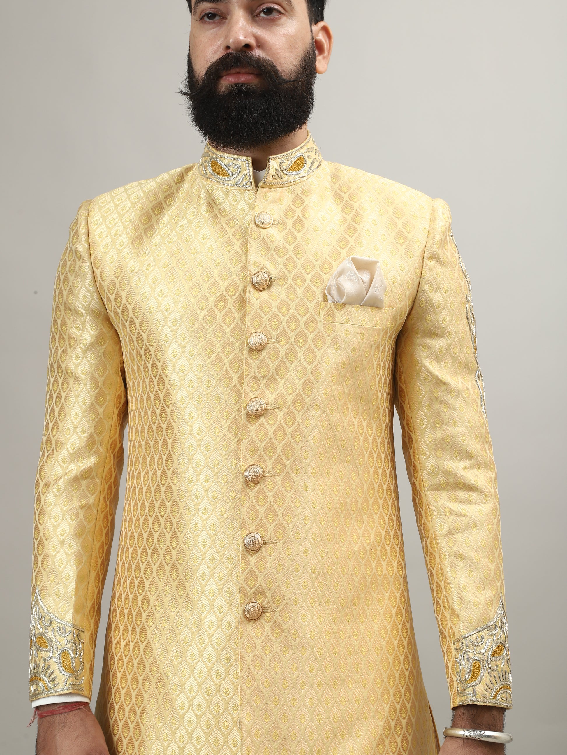 This Sunlit Gold Sherwani from Rajanyas is designed for the modern groom who values tradition, craftsmanship, and understated luxury. The fabric features an all-over traditional Indian motif, inspired by heritage textile artistry, lending depth and richness without overpowering the silhouette.