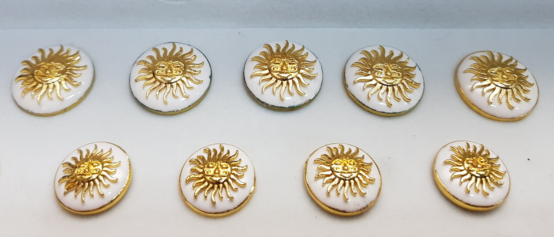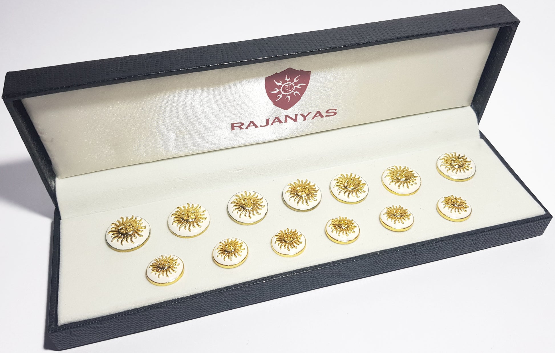 A set of 13 Buttons, crafted exclusively by our skilled designers for Achkans, Sherwanis, Jodhpuri and Hunting Jackets. Each button is handmade using the age-old enamelling technique of Cloisonné.